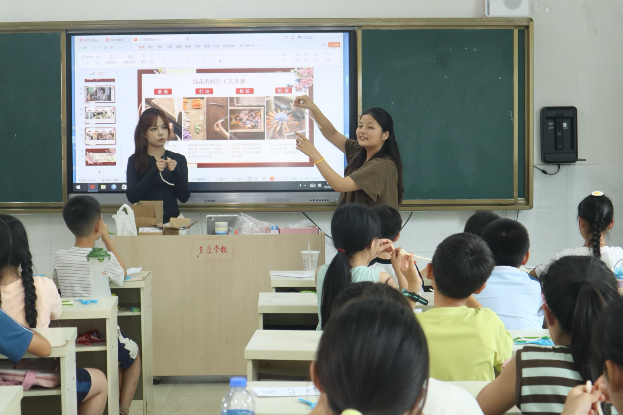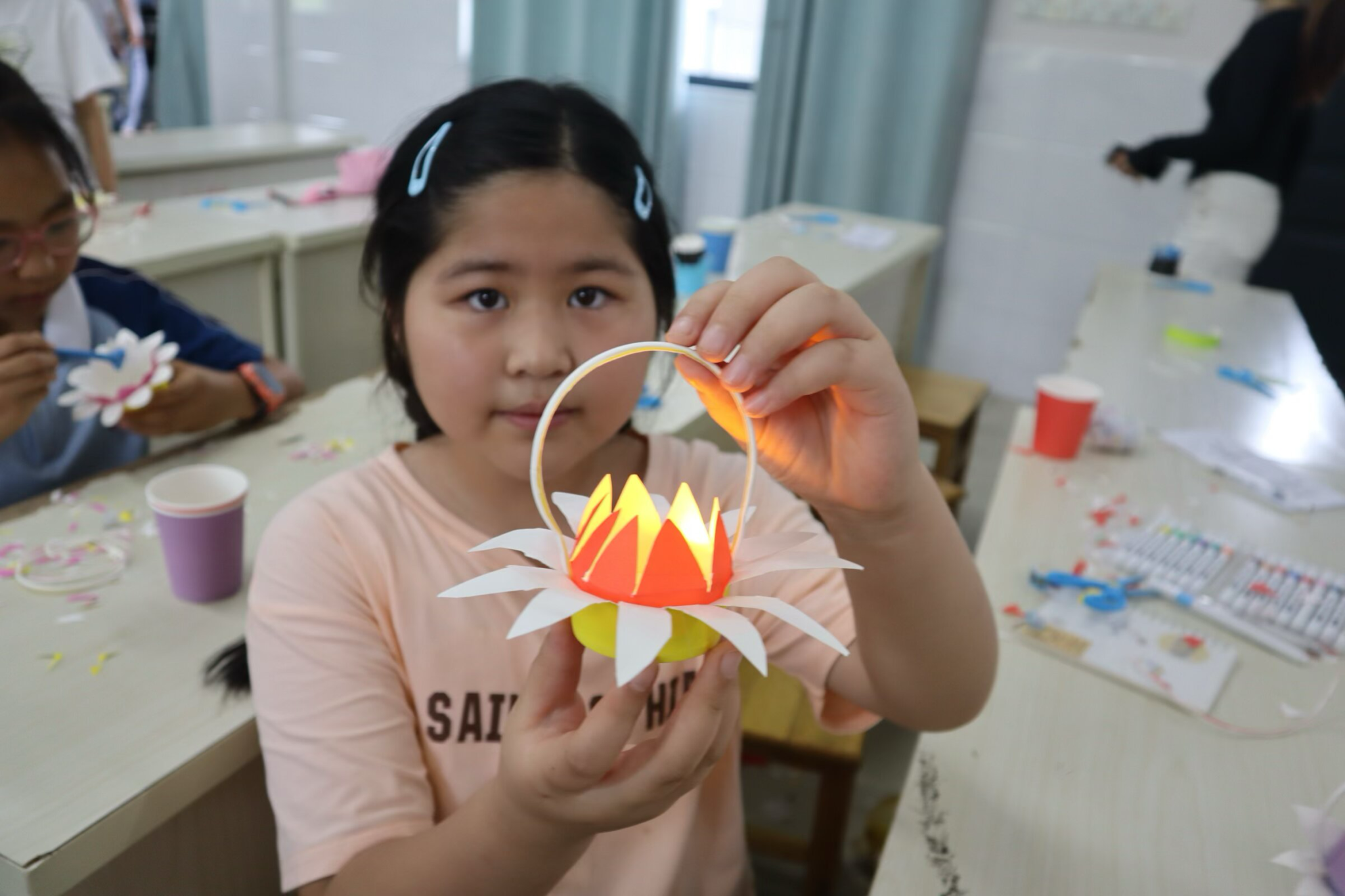 此次系列特色课程包括民族舞、非遗手工课等等,课程内容丰富,教学形式多样,民族艺术和创意实践融合。实践团成员龙冰茹开展了“苗族民族舞—弥渡山歌”课程,将苗族文化知识巧妙融入课堂。孩子们通过学习苗族民族舞蹈动作,感受苗族舞蹈魅力,体验歌舞交融的独特艺术风情。由李睿姝主讲的“变废为宝——小小纸杯变花灯”课程,以环保理念为核心,引导孩子们将生活中常见的废弃纸杯收集起来。通过剪裁、粘贴、彩绘等步骤,孩子们把普普通通的纸杯改造成花灯,不仅锻炼动手能力,还增强环保意识。谭晶晶的“南京绒花知多少”课程,带孩子们探秘非遗绒花,了解历史、工艺。设置实践环节,让孩子们亲手体验绒花制作,感受传统技艺魅力。