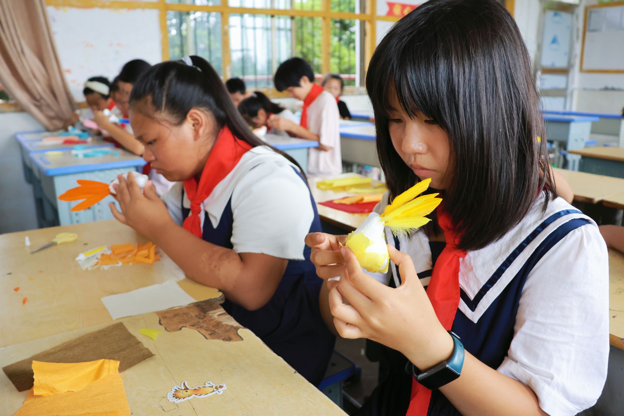 实践团聚焦本土候鸟,以图文并茂的形式展开科普。在知识竞答“根据描述猜鸟类”竞赛中,学生通过实践团成员提供的线索抢答、互动实践,深化护鸟意识。为了让生态保护理念更加深入,实践团设计了一场候鸟手工课。实践团成员们提前用彩色卡纸剪裁出羽毛、身体、嘴、眼睛等制作的材料。在课堂上,每位学生领取一枚候鸟贴纸,根据候鸟贴纸的形象来制作。实践团分组指导拼装,结合鸟类特征进行讲解,让学生们在动手实践中深化认知。学生们在实践团成员指引下到室外为手工小鸟寻找鸟窝模型,认识守护鸟类栖息地的重要性。