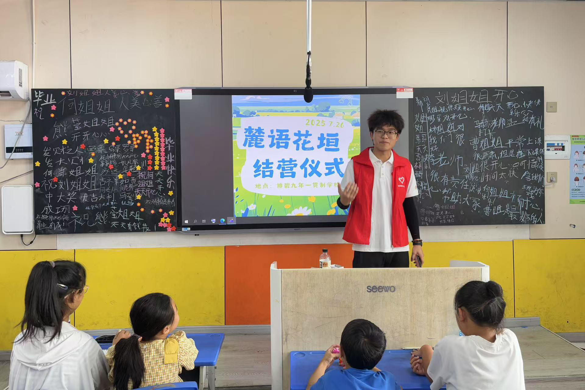 队长曹泽雨开场发言。他代表实践团向排碧学校、当地教师以及参与活动的学生表达了谢意,并对过去一段时间的支教调研工作进行了简要回顾。随后,活动进入学生心声表达环节。孩子们在信纸上写下这段学习生活的感悟,在黑板上留下对教学组成员的祝福。