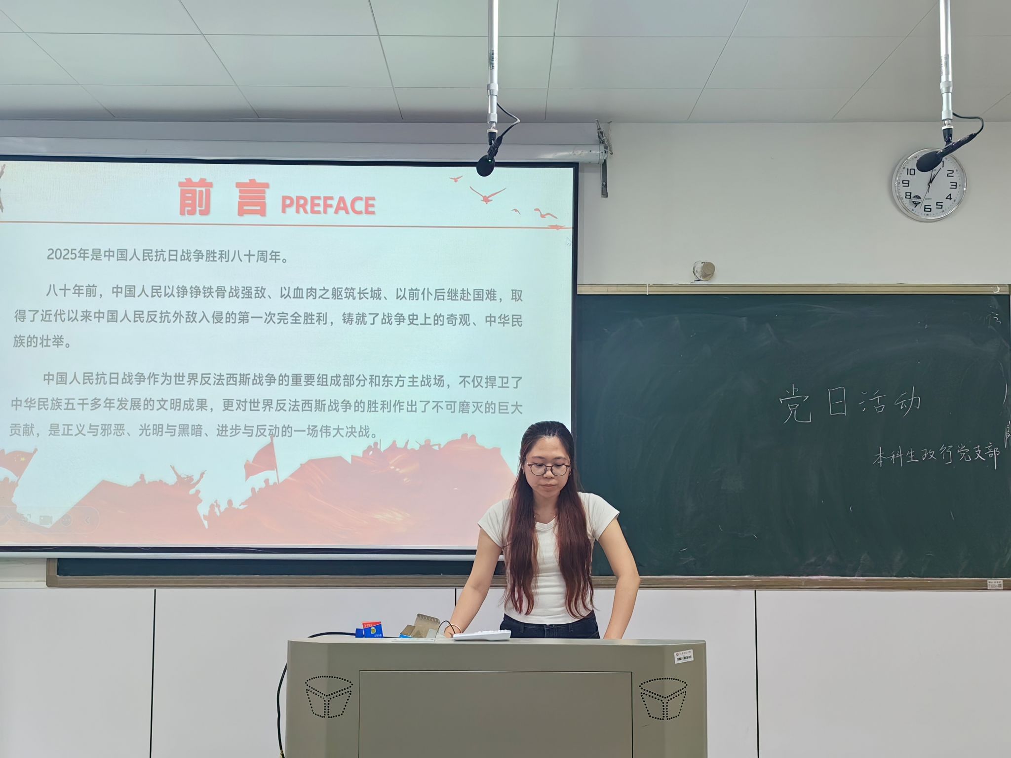 (通讯员 武尘钰 樊星 谭欣雨)9月10日中午12点,本科生政治学与行政学党支部在公共管理学院景德楼中栋112教室举办九月党日活动。此次党日活动的主题为“铭记历史,弘扬伟大抗战精神”,由政治学与行政学班23级王蕊担任主讲人,本科生政治学与行政学党支部全体支部成员参与学习。