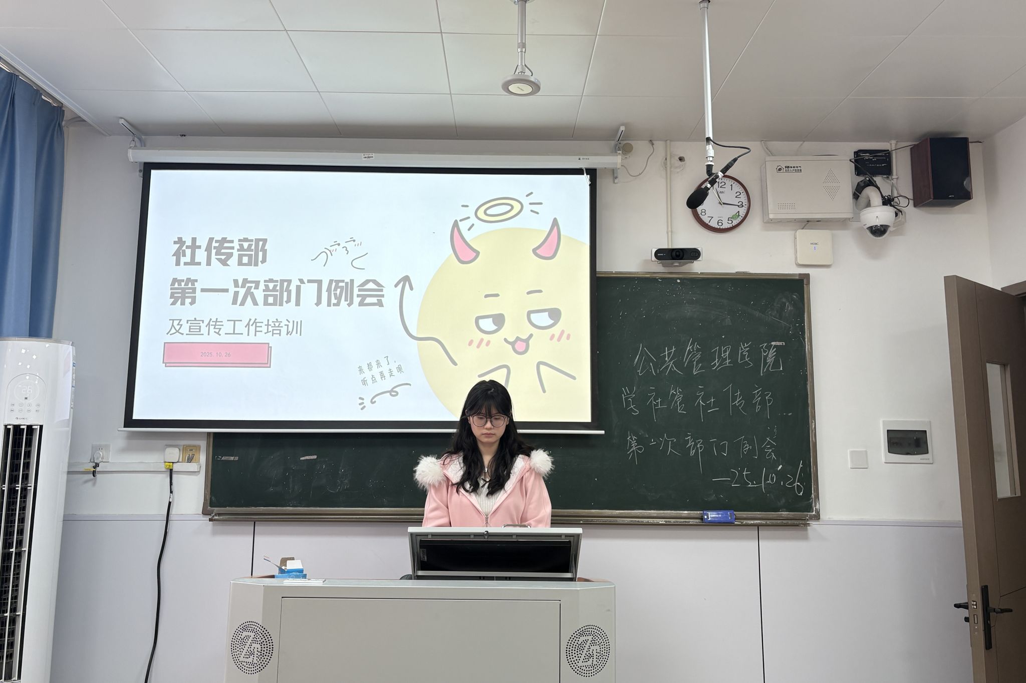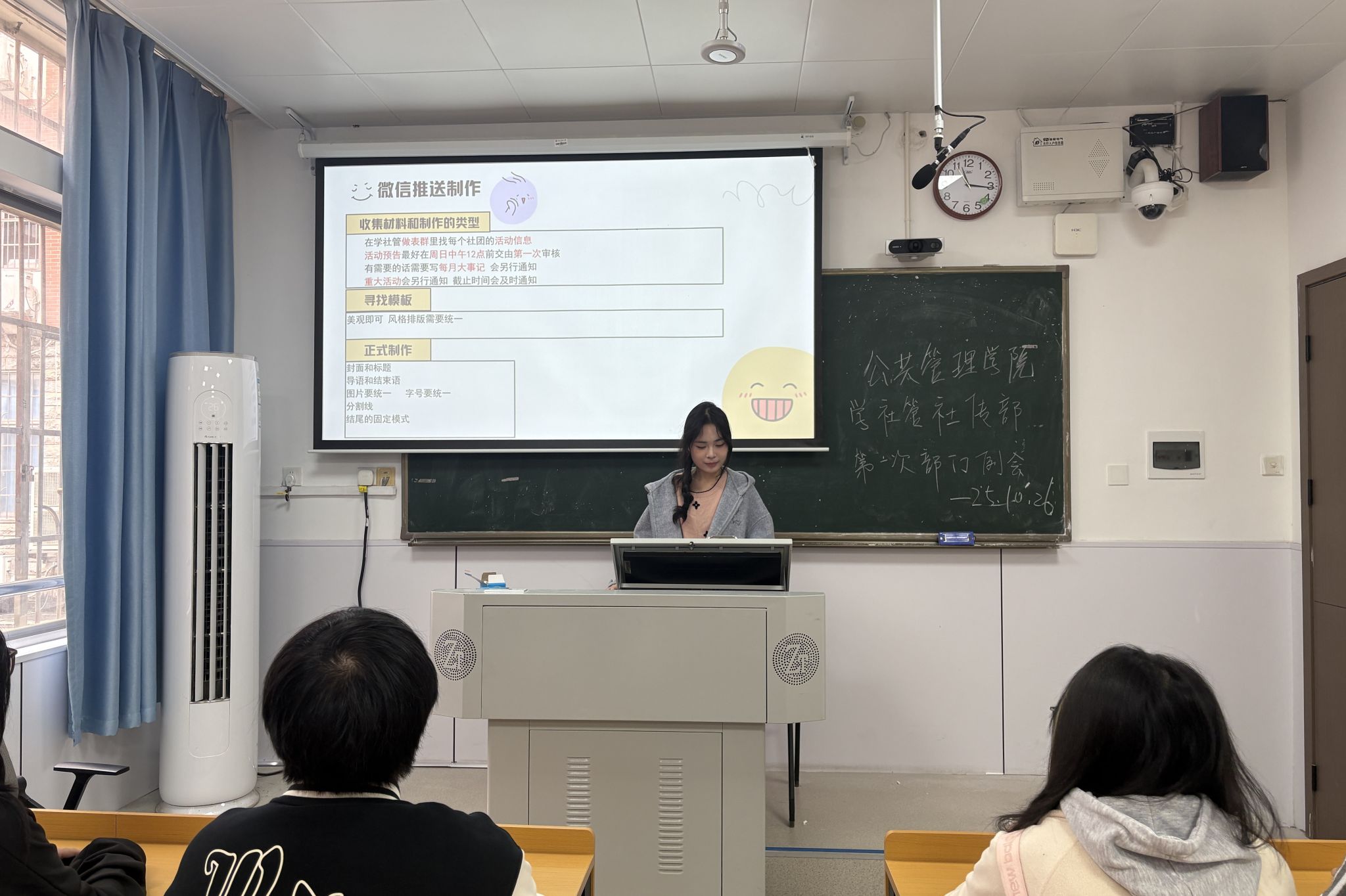 (通讯员 潘妍 代莉文)为帮助新成员快速熟悉部门工作体系,促进部门成员之间的沟通交流,凝聚团队力量,推动社团文化传播稳步前行,10月27日中午,公共管理学院(以下简称“公管院”)学生社团管理中心社团文化传播部于景德楼中栋111教室召开本学期第一次线下例会并进行宣传工作培训。此次参会人员包括公管院学生社团管理中心文化传播部部长代莉文、副部长钟嘉琪以及四位干事。