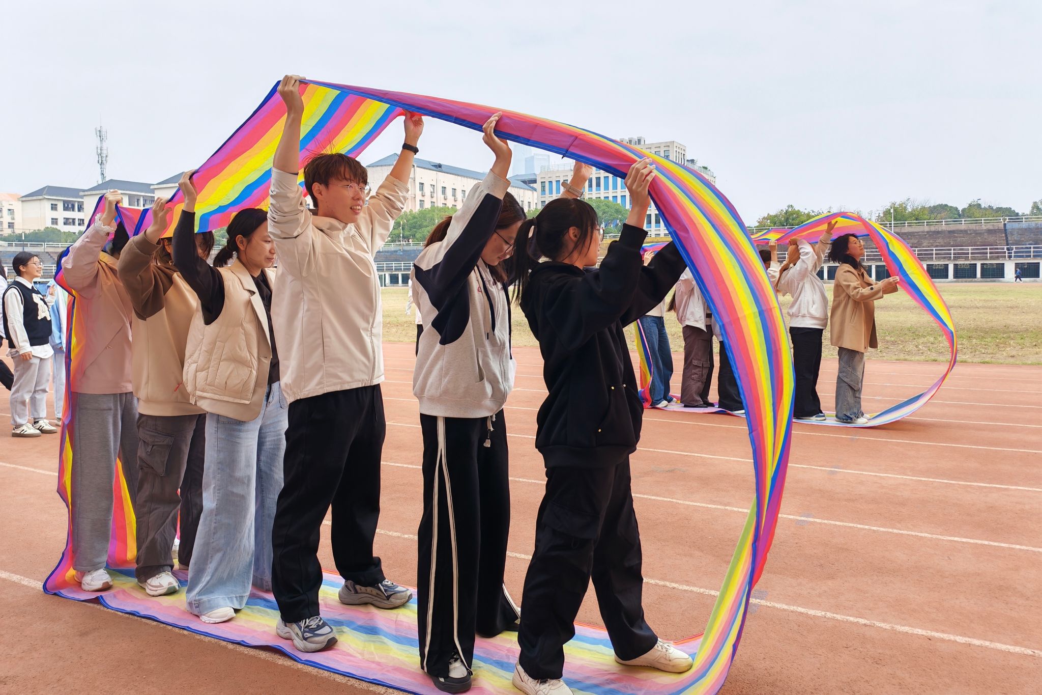 10月25日,健康服务部在北院田径场举办“携手滚轮,共赴心程”车轮滚滚游戏活动。6人一组组队参赛,裁判发出指令后参赛队员共同撑起道具同步向前行进,全程脚不得接触地面,最终以最后一名队员通过终点用时决出胜负,活动设置一二三等奖并给予奖励。