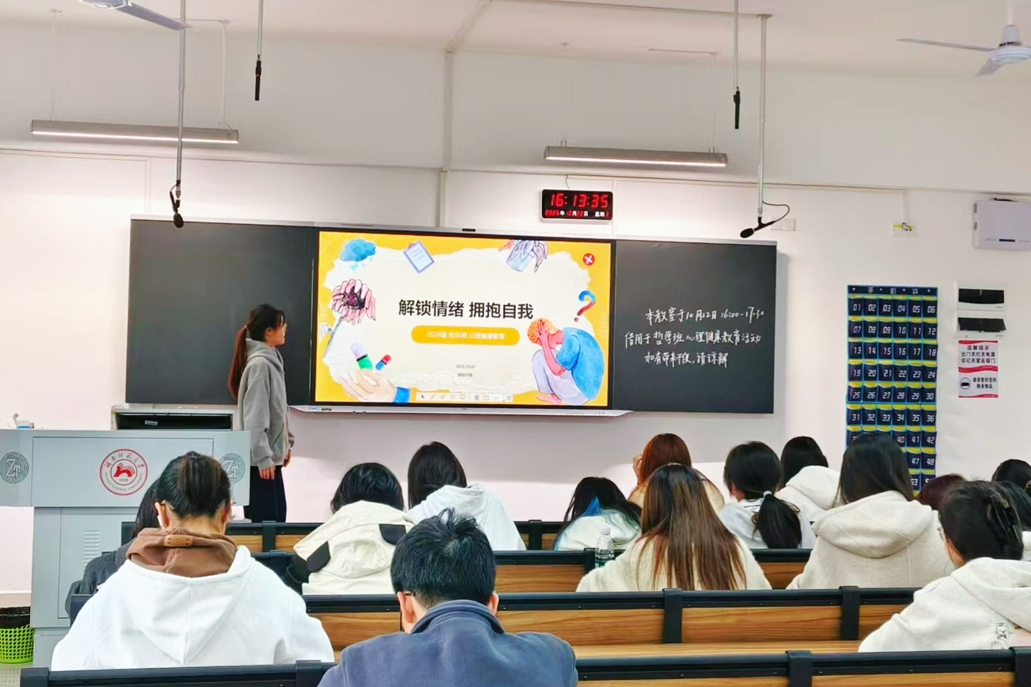 10月11日至24日,“解锁情绪,拥抱自我”心理健康主题班会由各班心女委牵头组织开展,活动照片经收集后在公管院微信公众号推送展示。同期,“方寸之间,寄语未来”心灵便利贴活动同步推进,同学们按照要求填写两张便利贴,大一、大二的同学分别向未来的自己作出自我关怀承诺、向大四学长学姐送上鼓励,心女委收集后交由健康服务部,在二里半校区景德楼与张公岭校区综合楼集中展示。