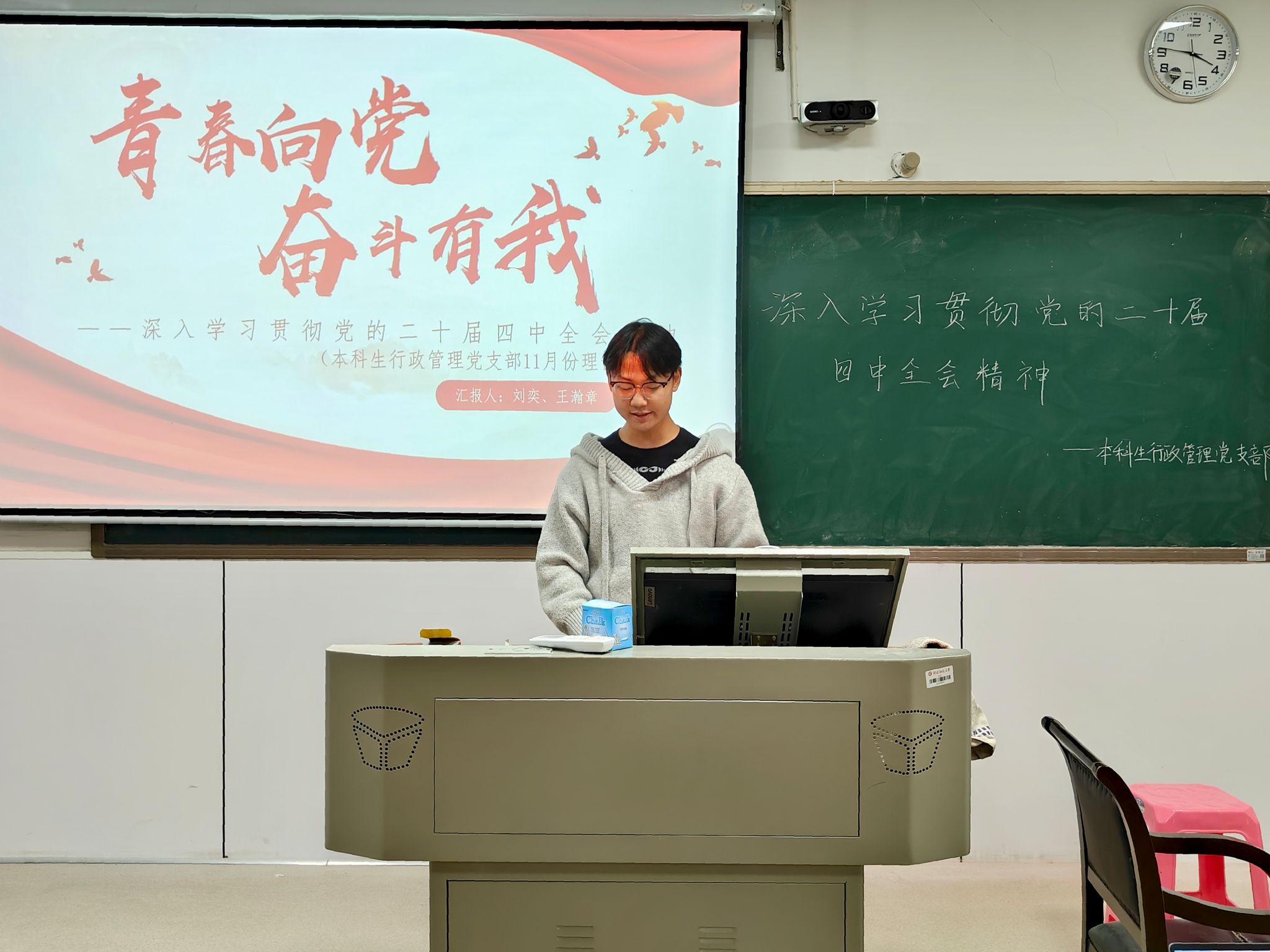 活动中,王瀚章结合当前国际动荡变革与国内改革发展攻坚的双重形势,系统概括了二十届四中全会全会召开的时代背景与核心要义,阐明其在推进国家治理体系和治理能力现代化进程中的重大战略意义,帮助支部成员把握新时代行政管理领域的发展方向与实践要求。同时,王瀚章聚焦二十届四中全会部署的重点任务,从发展目标、核心原则及关键领域等方面进行梳理,清晰呈现二十届四中全会精神对基层治理创新、公共服务优化、行政效能提升等具体工作的指导作用。讲解结束后,支部成员结合专业知识,就二十届四中全会精神落地实践路径进行研讨交流,明确支部将通过“集中研学+小组讨论+实地调研”的多元模式深化学习效果践行二十届四中全会精神。