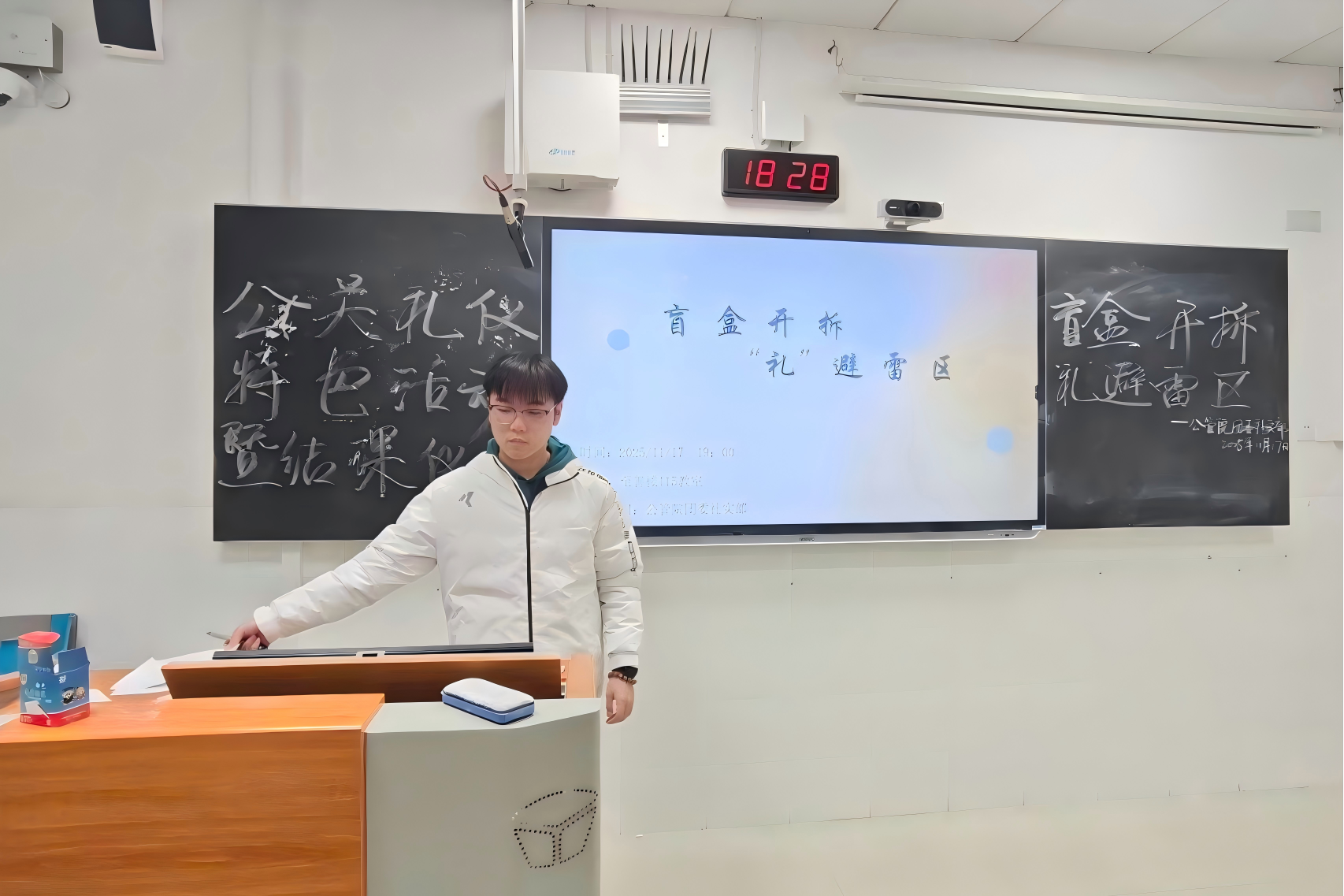 (通讯员 司文茜 刘晨昊 王涵钰)为提高同学们的国际社交能力,11月17日晚,公共管理学院(以下简称“公管院”)团委社会实践部(以下简称“社实部”)于至善楼115教室举办了公关礼仪课程第三次特色活动暨结课仪式“盲盒开拆,‘礼’避雷区”。公管院团委社实部负责人刘晨昊以及选修公关礼仪课程的学生参加了此次活动。