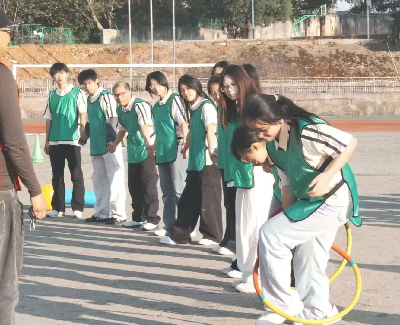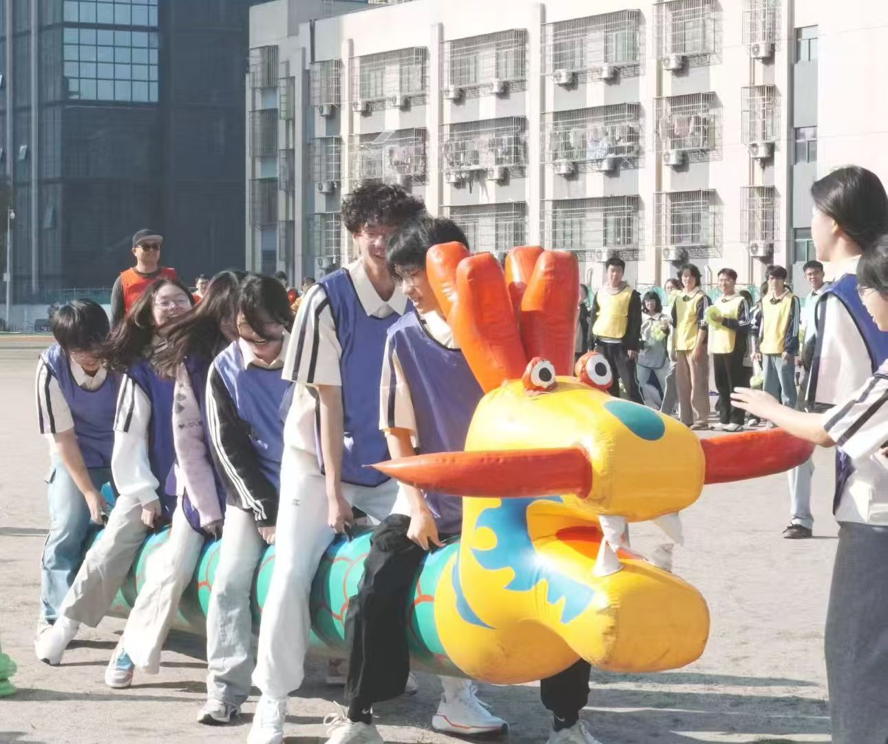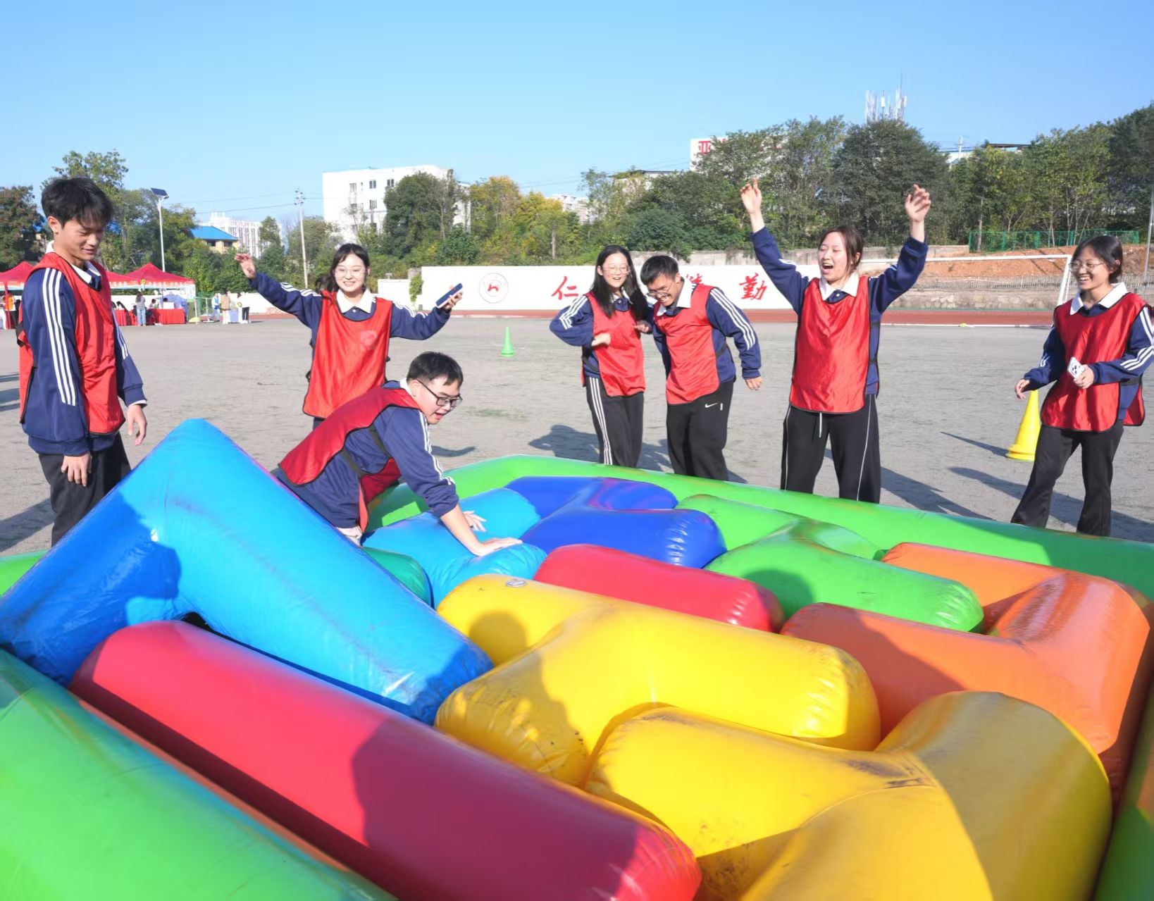 此次活动精心设计了“勇往直前”“万众一心”“快乐一起拼”“合力筑塔”“同心协作”五大特色项目,既考验个人反应速度,更注重团队协同配合。12支师生参赛队伍奋勇争先、互帮互助,时而挽手并肩同步奋进,时而屏息凝神专注协作,欢声笑语回荡在田径场的每个角落。