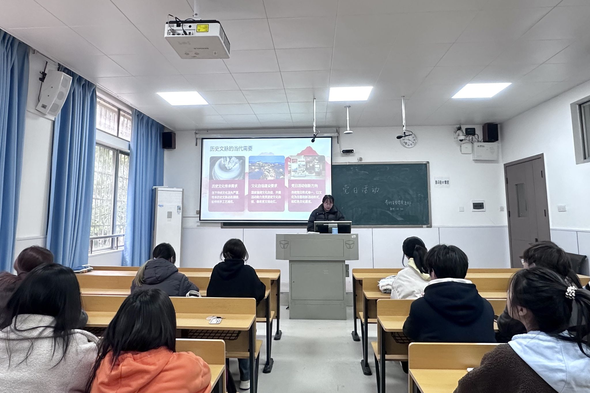 活动中,策划人张潇冉围绕活动概述、历史文脉内涵、文化自信意义、文化实践活动、坚定文化自信路径五个角度展开了分享。她结合传统文化流失、党日活动形式创新等现实需求,阐明活动初衷,详细介绍了“增强历史文化认知、提升文化自信意识、激发文化传承责任感”三大目标,并通过京剧艺术、《红楼梦》经典著作、春节端午民俗活动等视频,展现传统艺术、文学与节庆文化的独特魅力。在文化自信意义解读环节,张潇冉介绍了抗疫精神、四大发明、航天成就等实例,并分享了它们在增强民族凝聚力、激发创造力、提升自豪感等方面的重要意义,展现了文化自信对民族发展的支撑作用与重大价值。