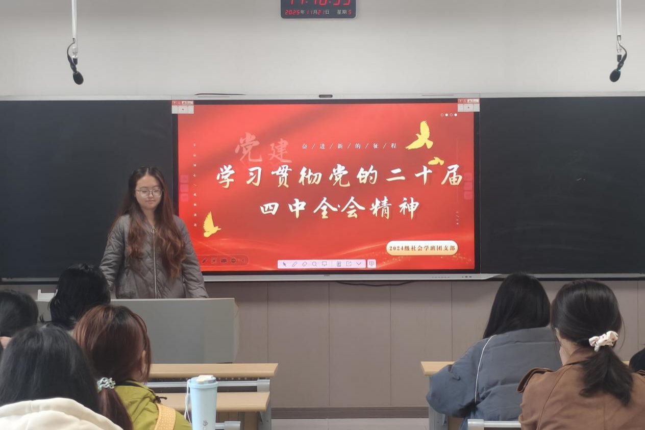 (通讯员 宋妍希 刘梦瑶 王涵钰)为深入学习贯彻党的二十届四中全会精神,引导团员青年深刻领会“十五五”时期发展目标与重点任务,进一步增强“四个意识”、坚定“四个自信”、做到“两个维护”,11月21日,公共管理学院2024级社会学班团支部在桃花坪校区第四教学楼102教室组织开展了主题团日活动。此次活动由团支书刘梦瑶主持。