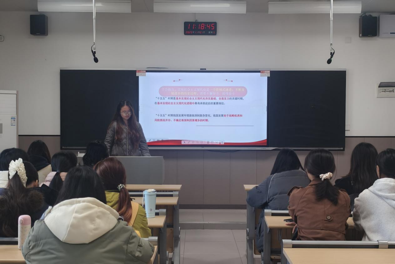 活动伊始,刘梦瑶向全体同学系统阐述了二十届四中全会的基本情况、核心内容及其重大意义,帮助同学们构建起对会议精神的整体性认知框架,明确了学习领会的重要方向。刘梦瑶聚焦“六个坚持”基本方略,对其理论内涵、实践要求进行了深入讲解,并通过结合社会发展实例与理论分析,深化了同学们对新时代党的创新理论的理解。随后,同学们集体观看了中央宣讲团关于“十五五”时期国家发展规划的专题辅导报告视频。视频内容详细解读了未来五年的主要目标、重点任务与战略部署,使同学们对国家发展的宏伟蓝图与实施路径有了更为直观和全面的了解。