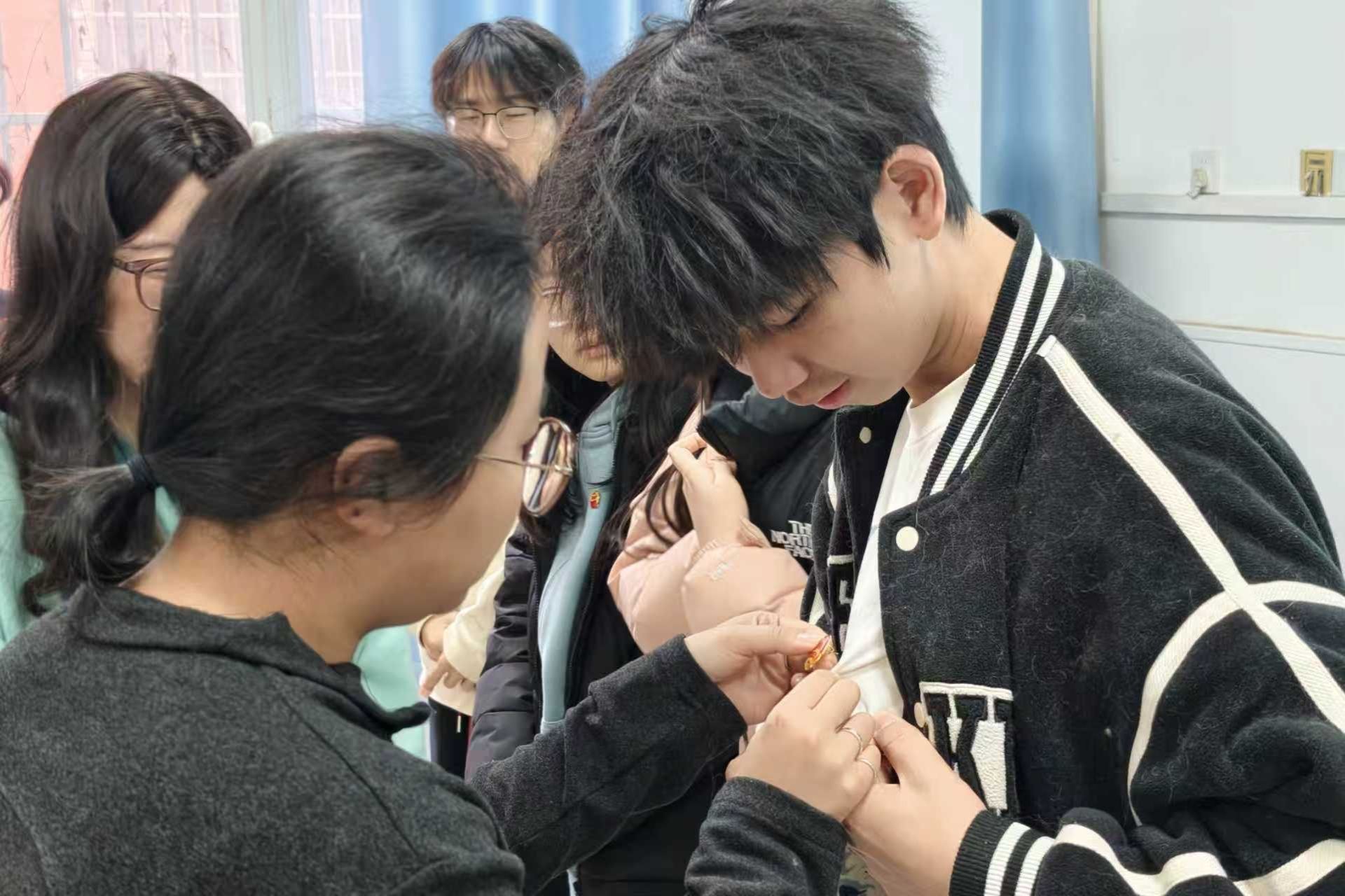 仪式于国歌声中开始,全体参会人员肃立,奏唱国歌。国歌奏唱完毕后,由老团员为新团员佩戴共青团团徽,团徽即代表团员身份,也寄予团员责任与国家担当。而后进入了新团员入团宣誓环节。在领誓人的带领下,全体新团员举起右拳,进行了庄严的宣誓。他们用坚定的誓言表达了成为一名共青团员的光荣与责任,展现了为共产主义事业贡献力量的决心。