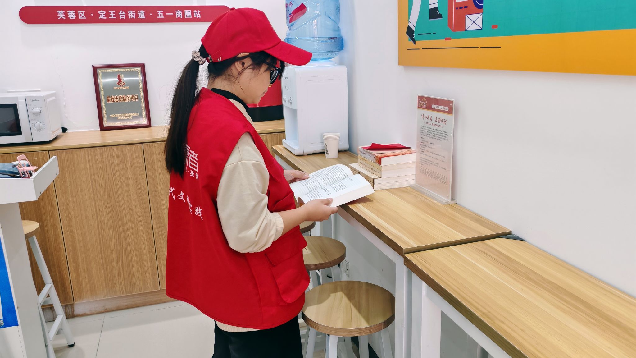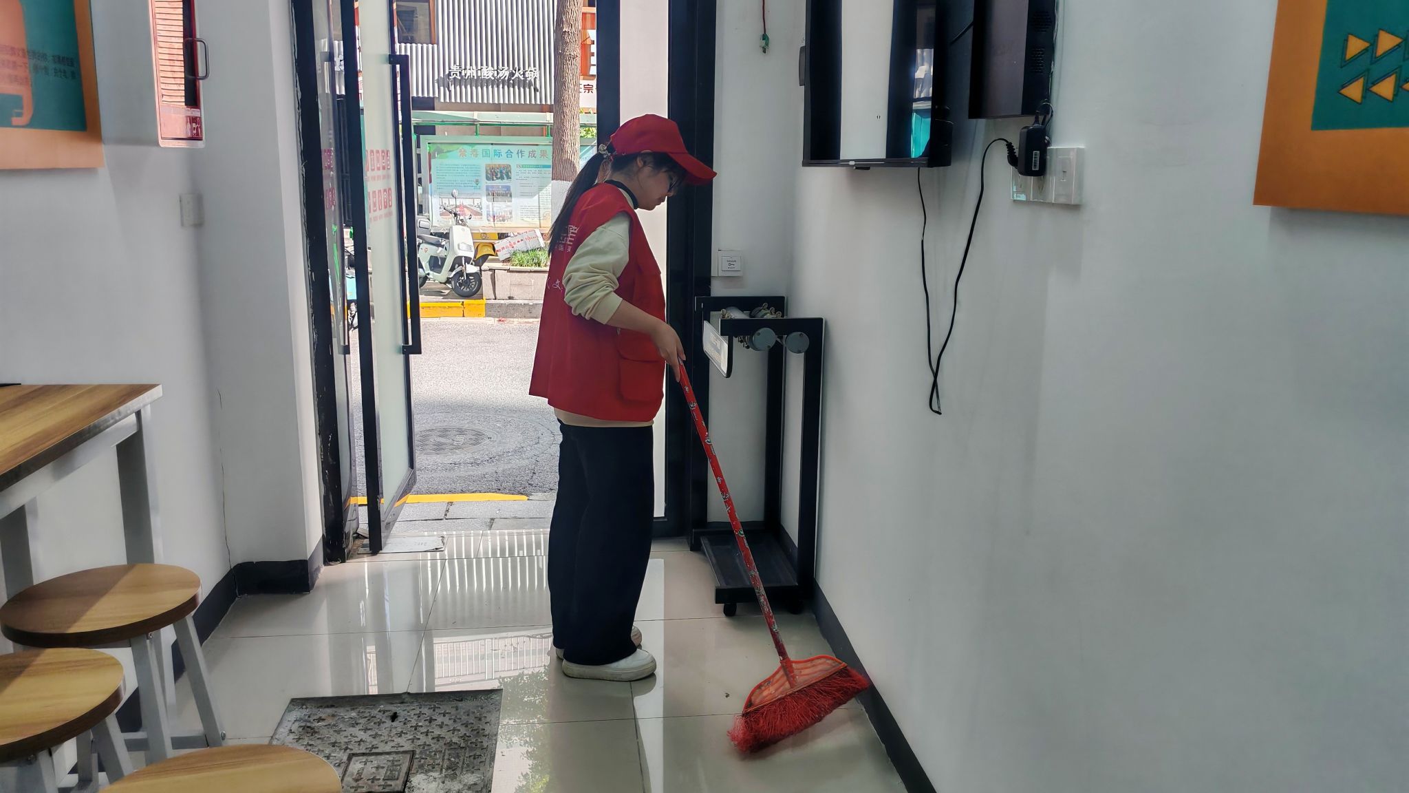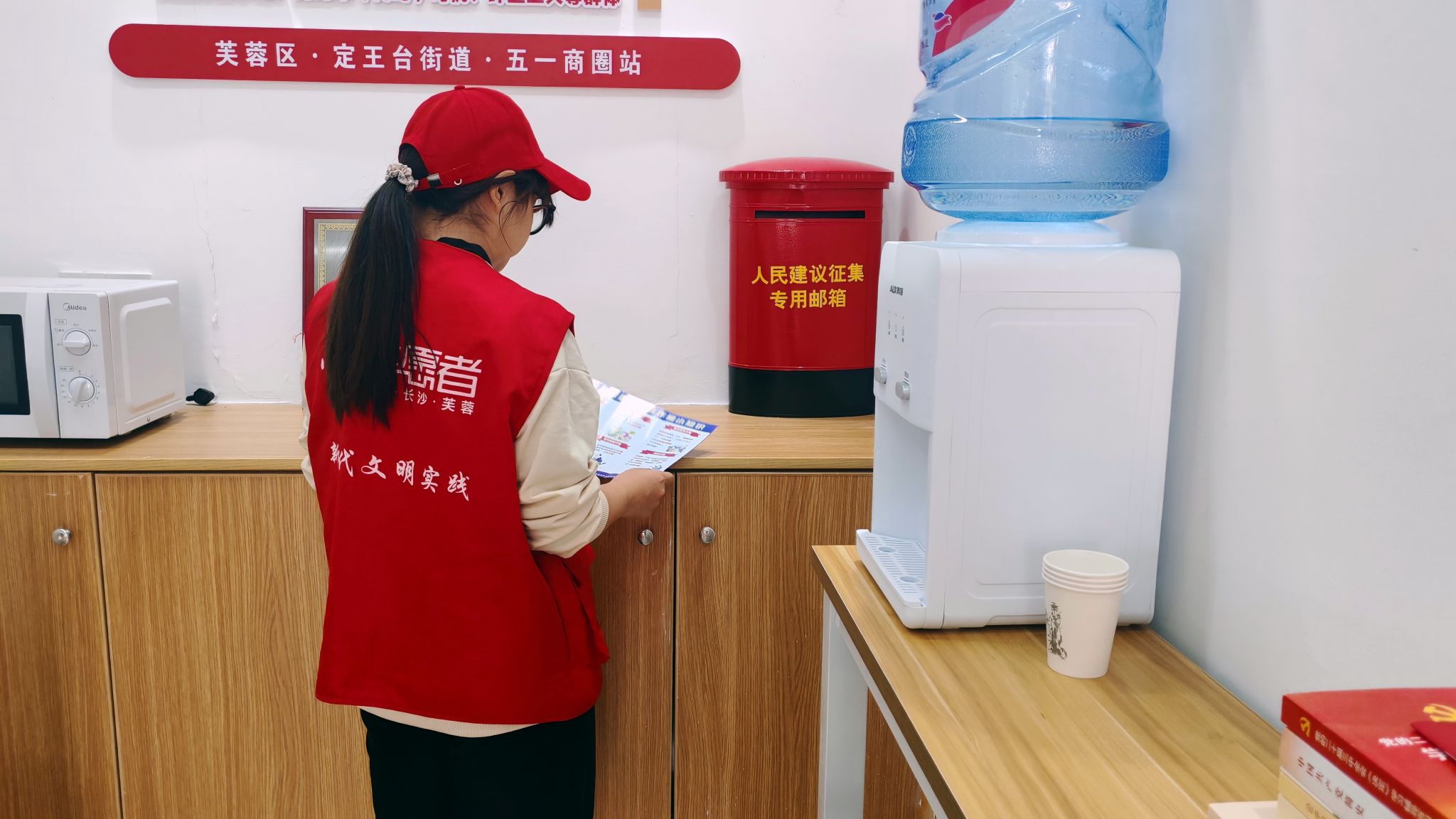 活动中,志愿者们整理应急药箱,对创可贴、碘伏、纱布等急救物资逐一清点核查,确保各类用品储备充足、摆放规范,随时满足应急需求;志愿者们同步对门店入口区域进行全面清扫,清理零散垃圾、规整环境秩序,为群众营造整洁舒适的出入环境。在便民服务角,志愿者们将宣传手册、书籍等资料分类梳理、整齐陈列;针对“人民建议征集邮箱”周边区域,他们重点对各类政策宣传材料进行分类归置、有序摆放,以便于政策信息传递的顺畅,方便群众快速取阅、精准了解。