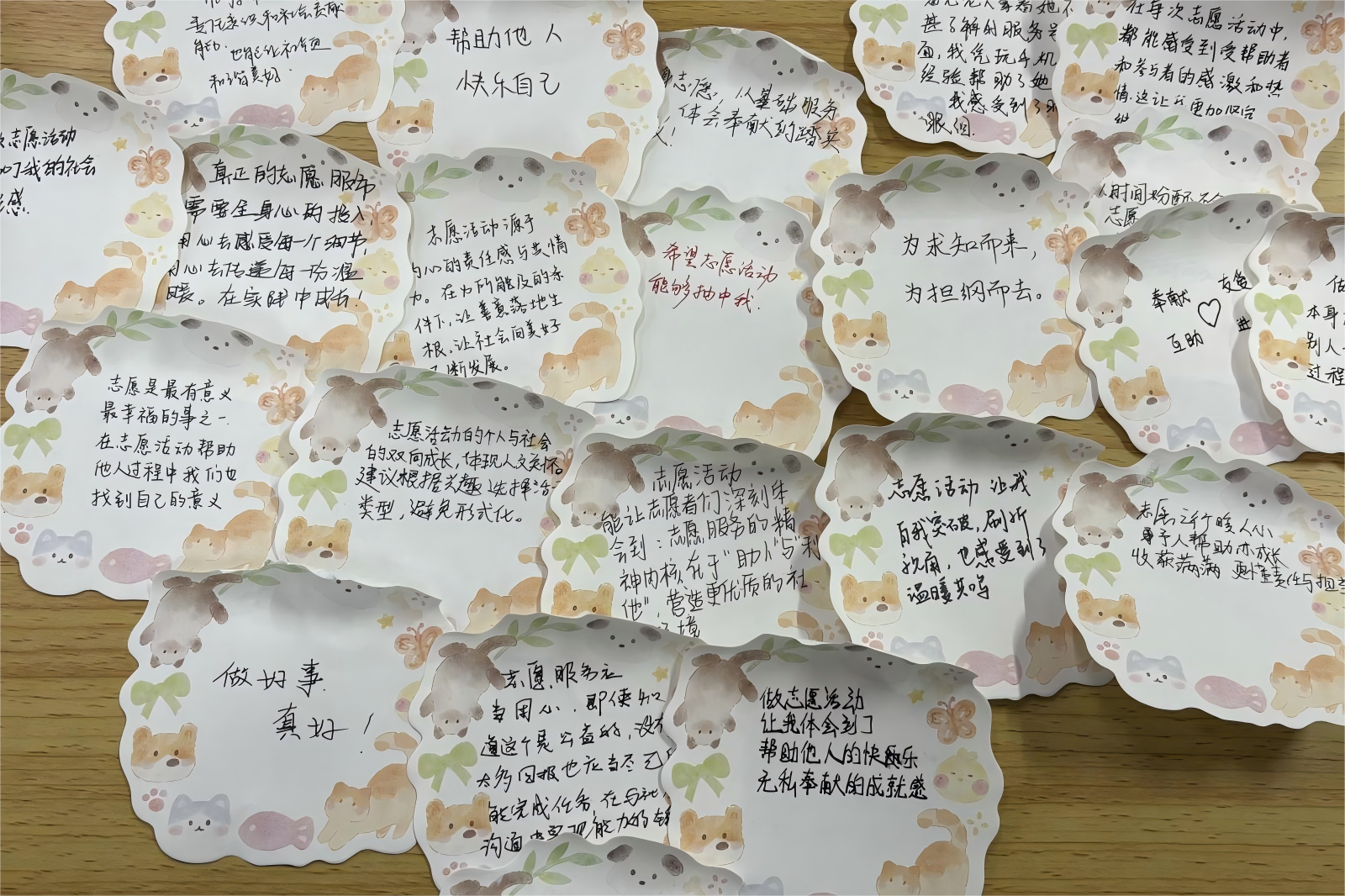 班级还特别制作了“心得爱心墙”,同学们将自己的志愿感悟写在便签纸上,逐一贴在爱心墙展板上。大家围站在爱心墙前相互交流,在思想碰撞中加深了对志愿服务的理解。