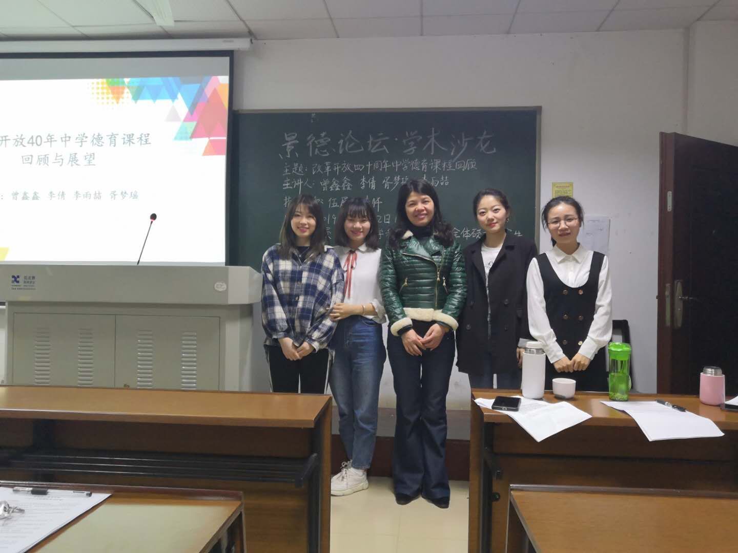 (通讯员:李倩 李宇晴)2019年4月12日晚18:30,我院于公管楼312教室举办了2018级第12期“景德论坛·学术沙龙”。本次活动以“改革开放40年中学德育课程回顾”为主题,来自学科教学(思政)专业的李倩、胥梦瑶、李雨喆、曾鑫鑫四位同学为本次活动的主讲人,杨晓云同学为主持人,并邀请了思想政治教育学系伍屏芝老师前来指导。