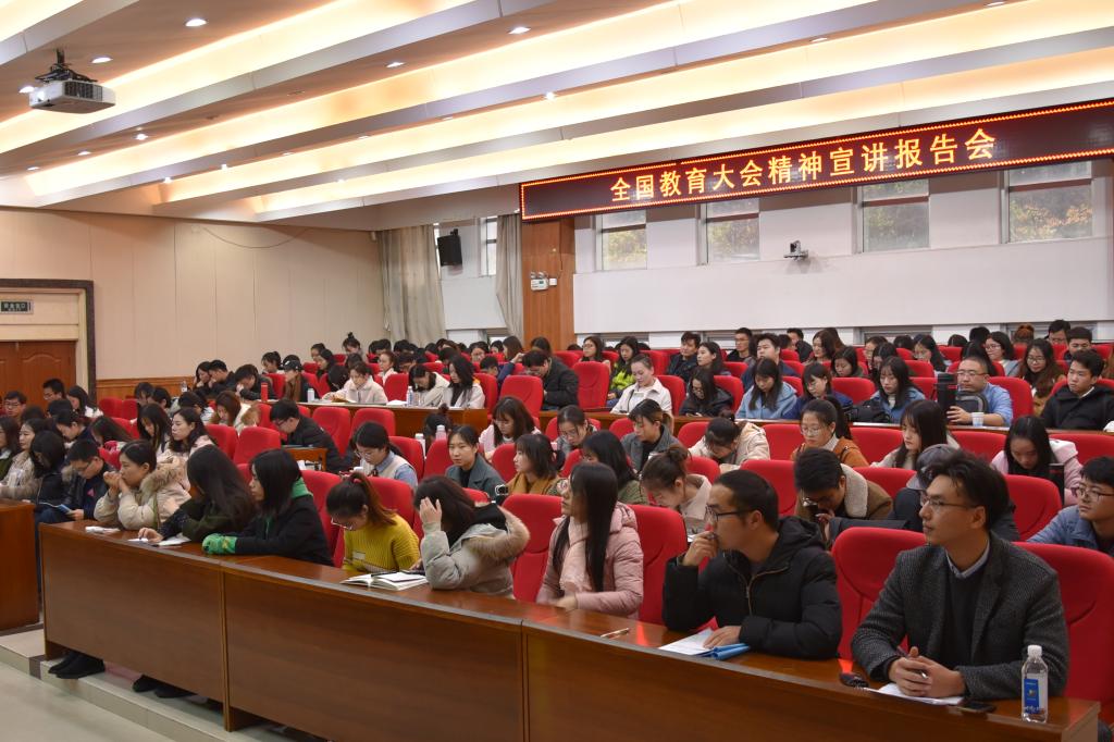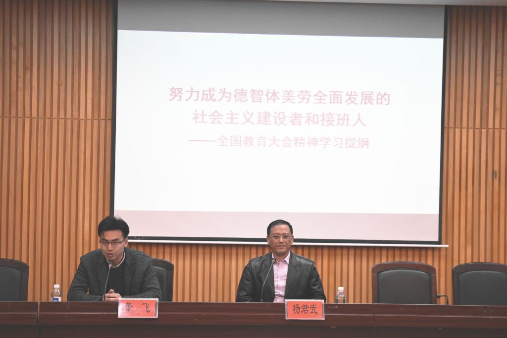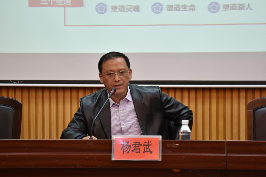 杨君武教授重点解读了习近平总书记在全国教育大会上所做的重要讲话。他指出,习近平总书记的讲话具有很强的政治性、思想性、战略性以及现实针对性,是做好新时代教育工作的纲领性文件。他从六个方面对讲话主旨进行了解读:一、关于习近平总书记教育思想的基本观念——“九个坚持”。坚持党对教育事业的全面领导,坚持把立德树人作为根本任务,坚持优先发展教育事业,坚持社会主义办学方向,坚持扎根中国大地办教育,坚持以人民为中心发展教育,坚持深化教育改革创新,坚持把服务中华民族伟大复兴作为教育的重要使命,坚持把教师队伍建设作为基础工作。二、关于教育的重要意义——“两个大计”。教育是国之大计,党之大计,必须优先发展。教育兴则国兴,教育强则国强。“两个一百年”奋斗目标的实现、中华民族伟大复兴中国梦的实现,根本还要靠人才、靠教育。三、关于教育发展思路、主要职能以及主要类型——“三个更加”、“五个人”、“五育”。要以更加高远的历史站位、更加开阔的国际视野、更加深邃的战略眼光超前布局我国教育事业。教育要达成凝聚人心、完善人格、开发人力、培育人才、造福人民的目标。教育要德智体美劳五育并举,培养全面发展的新人。四、关于学生主要目标及教师基本职责——“六方面功夫”、“两方面职责”。学生应当在坚定理想信念、厚植爱国情怀、加强品德修养、增长知识见识、培养奋斗精神、提升综合素质六个方面下功夫。教师应当履行好传播知识、传播思想、传播真理和塑造灵魂、塑造生命、塑造新人两个方面职能,做有理想信念、有道德情操、有扎实学识、有仁爱之心的“四有好老师”,成为引导学生锤炼品格、学习知识、创新思维、奉献祖国的引路人。五、关于教育改革重点领域——“四大任务”。要在教育评价、教育管理、教育服务经济社会发展、教育对外开放的体制机制四个领域深化改革,完成一批标志性、引领性、支柱性的改革任务。六、关于教育事业的保障力量——“一个根本”。坚持党对教育工作的全面领导,是搞好我国教育事业的根本保证。要练好学校党建工作“基本功”,抓牢思想政治工作“生命线”。办好教育事业,家庭、学校、政府、社会都有责任。
