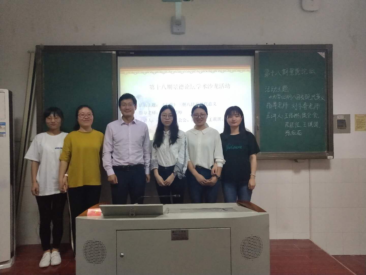 (通讯员:王珞琳 李雨喆)2019年4月19日晚18:30,我院于公管楼410教室举办了2018级第19期“景德论坛·学术沙龙”活动。本次活动以“《大学》三纲八目及现代意义”为主题,来自哲学专业的王珞琳、侯会会、晁佳佳、王琪琪、张娅茹五位同学为本次活动的主讲人,王珞琳同学为主持人,并邀请了哲学系刘永春老师前来指导。