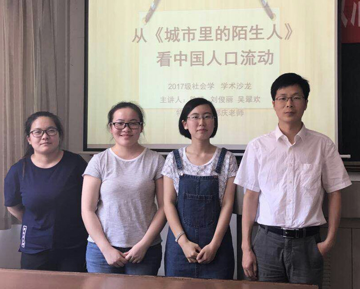 (通讯员 徐蒙翔)6月8日晚19点,我院于公管楼313教室举办了2017级第38期“景德论坛·学术沙龙”。本次活动以“从《城市里的陌生人》看中国流动人口”为主题,来自社会学专业的陈曦、刘俊丽、吴翠欢三位同学为本次活动的主讲人。本次活动邀请了社会学系郭庆老师作为指导嘉宾,并由郭红同学主持。