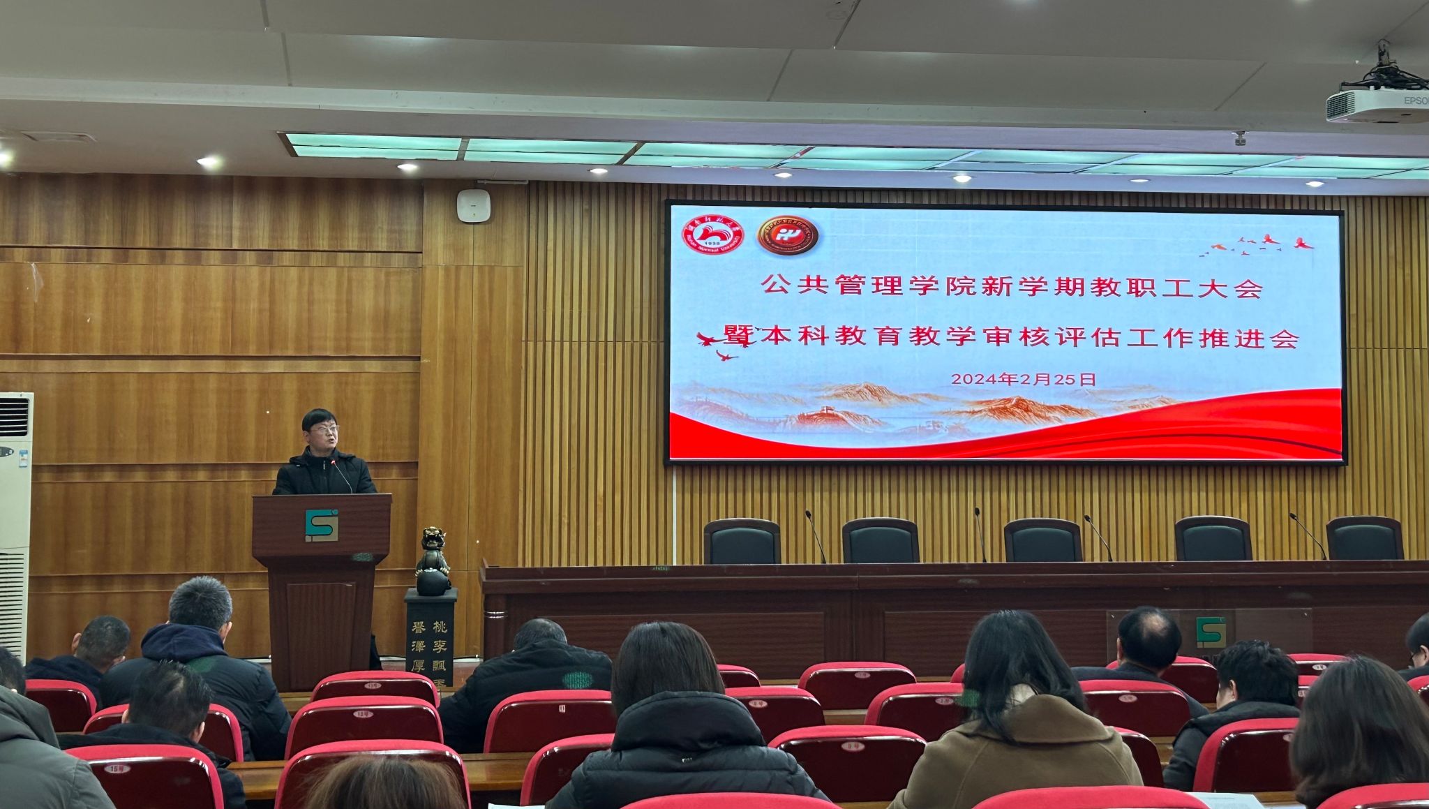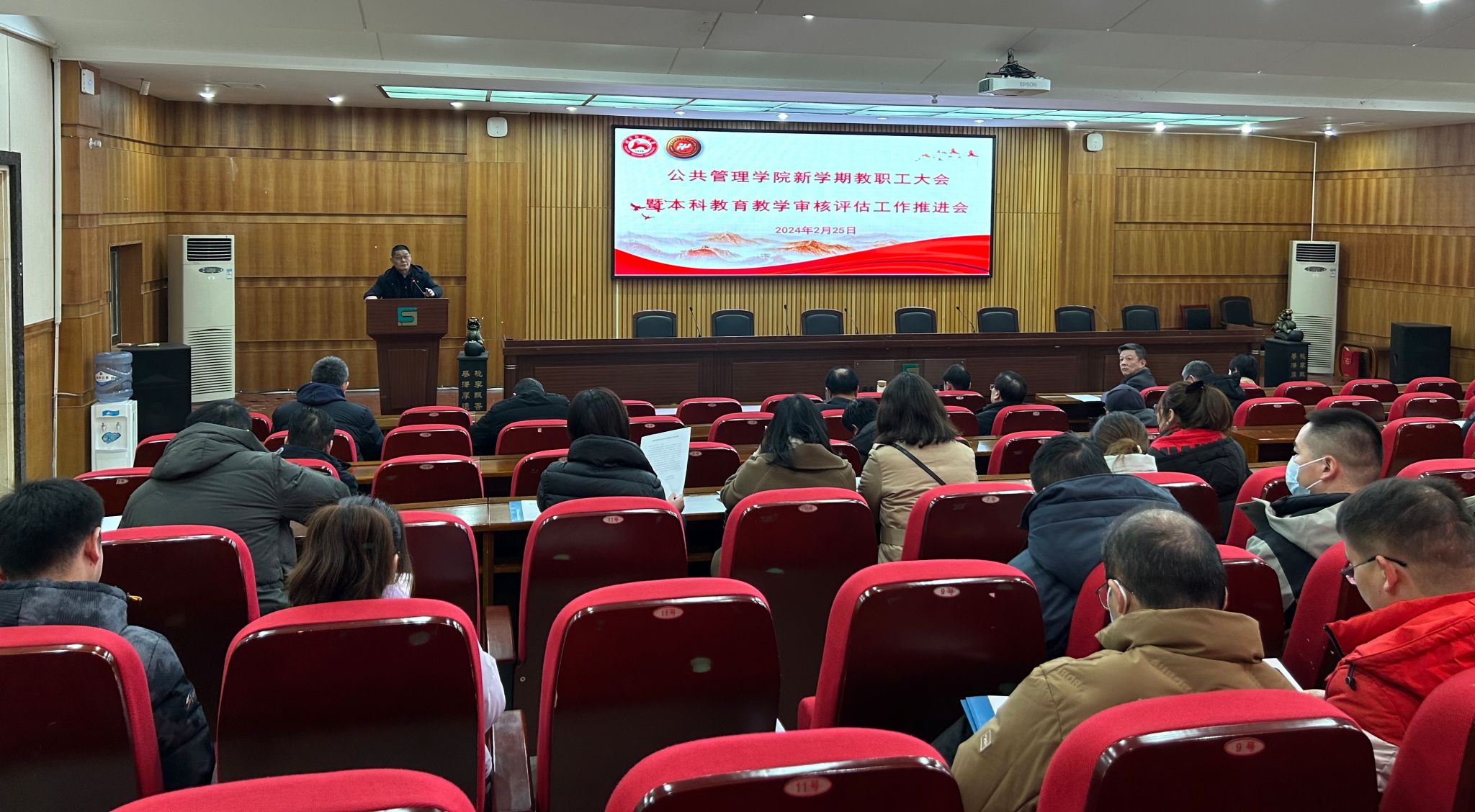 2月25日下午,我院在三楼学术报告厅召开新学期工作会议,为新学期工作谋篇布局,全面推进本科教育教学审核评估工作。学院全体教职工参加会议,党委书记余望成同志主持会议。