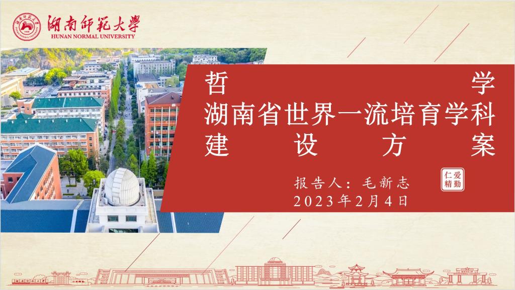 首先,公共管理学院院长、哲学学科负责人毛新志从建设基础、建设目标、建设口径、建设任务、预期成效、建设保障等六个方面,对湖南省世界一流培育学科(哲学)建设方案作了介绍。