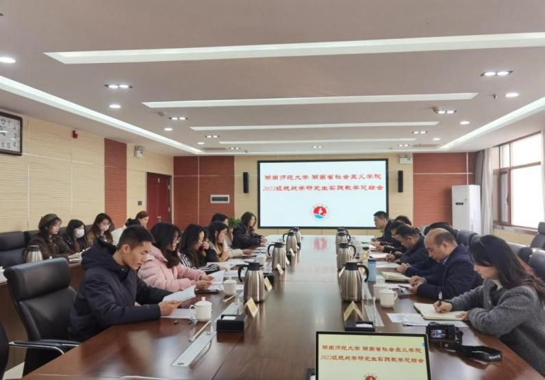 (通讯员:王晓航 易婧鸿)2023年12月29日上午,我院2022级统战学研究生实践教学总结会于湖南省社会主义学院(以下简称“省社院”)同心楼707顺利召开。湖南省社会主义学院二级巡视员彭仕敏,教研部李佑球主任、雷明贵教授、刘靖子副教授;我院院长毛新志教授,统战学硕士点负责人李超民教授,院研究生办胡耀飞老师出席会议。2022级、2023级全体统战学研究生参与本次会议。会议由李佑球主任主持。