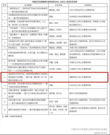 (通讯员:颜青)近日,中国公共治理案例与质性研究论坛官网公布了优秀论文名单。经过组委会进一步评审,在50篇入选论文中评选出15篇优秀论文,我院王绪同学的论文《党政统合与双向互动:党的领导优势转化为政府治理效能的行动逻辑——基于A县“最多跑一次”改革的扎根理论分析》入选,该文为两篇博士生作为第一作者的获奖论文之一。