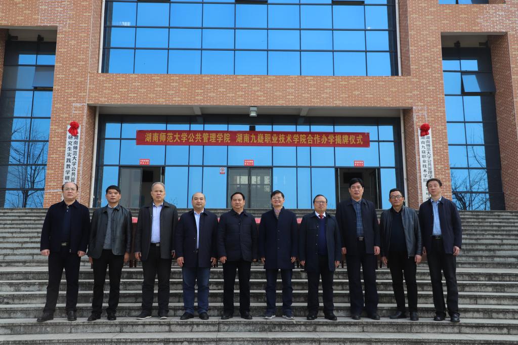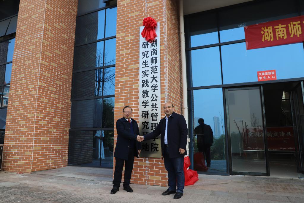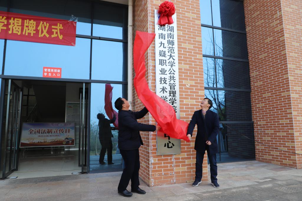 随后,毛新志院长与该学院党委副书记、院长唐海军代表双方签署合作协议。双方领导共同为“湖南九嶷职业技术学院湖南师范大学公共管理学院研学中心”和“湖南师范大学公共管理学院研究生实践教学研究基地”揭牌。