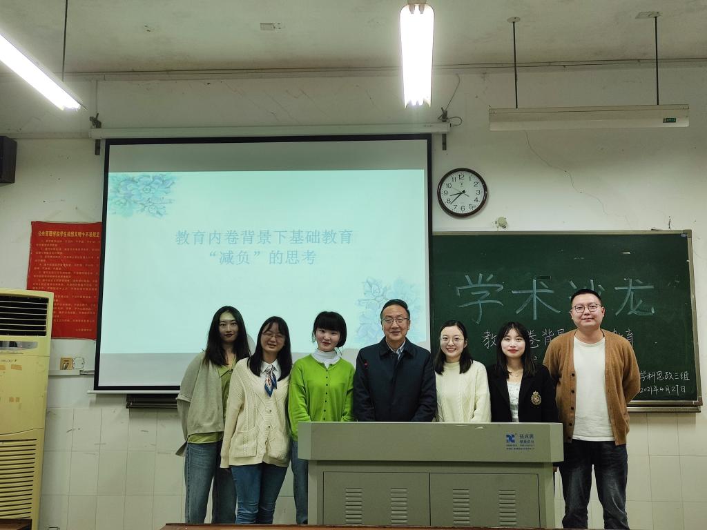 第24期“景德论坛·学术沙龙”活动以“教育内卷背景下基础教育‘减负’的思考”为主题,来自2019级学科教学(思政)专业的罗楚湘、罗天、杨红、伍佳琪、朱想五位同学为本次活动的主讲人,并邀请了政治学专业的蒋国海老师前来指导。五位主讲人探讨了教育内卷化产生的原因及存在的问题,并提出了目前基础教育“减负”的可行性对策。五位主讲人讲述结束后,蒋国海老师从中美对比的角度,对目前我国教育情况的产生原因以及发展趋势进行了详细分析,提出国内市场导向要进行优化、高等教育要进行质量转型的建议。