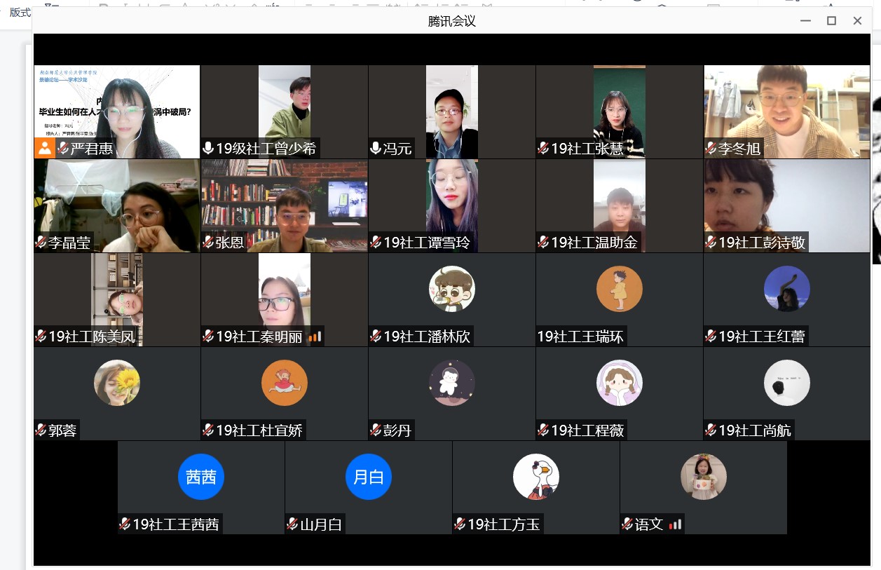 第22期“景德论坛·学术沙龙”活动以“内卷时代:毕业生如何在人才‘内卷’的漩涡中破局”为主题,来自社会工作专业的严君惠、张宇雯、陈美凤、张慧、谭雪玲、曾少希六位同学为本次活动的主讲人,并邀请了冯元老师作为指导嘉宾。六位主讲人介绍了“内卷”的由来、原因、影响、实施策略,并针对现代人才“内卷”的现状,并提出了可行的对策建议。冯元老师对同学们的讲解作了精彩点评,同