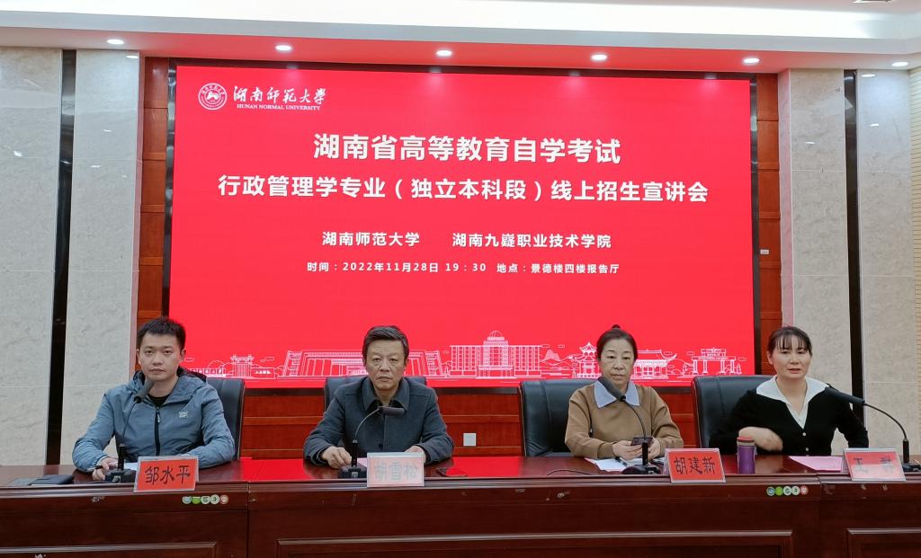 11月28日晚,由湖南师范大学公共管理学院和湖南九嶷职业技术学院联合举办的自学考试行政管理学专业(独立本科段)第二场线上招生工作推进会暨招生宣讲会在我院博后楼4楼报告厅顺利举行。湖南九嶷职业技术学院副院长唐红星、技能鉴定与短期培训教学系负责人刘小禄、各系部主任、书记和我院副院长胡雪松、李超民、胡建新副教授、成教办主任王群出席了会议。会议由我院成教办邹水平主持。