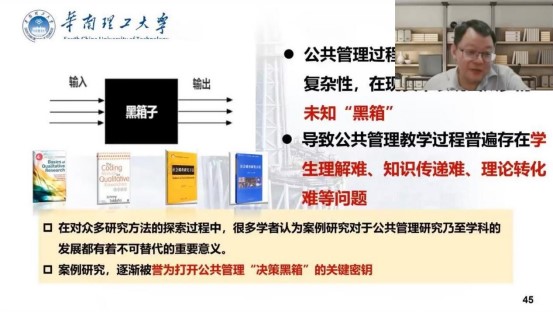通讯员(方杰)11月17日晚,湖南师范大学MPA大讲堂第三讲暨公共管理案例大赛专题讲座在景德楼南栋四楼学术报告厅顺利举行。华南理工大学公共管理学院博士生导师、MPA中心主任文宏教授应邀开展了题为“公共管理案例编写要点与理解进阶”的专题讲座。此次讲座由公共管理学院MPA中心执行副主任刘茜副教授主持,公管院全体MPA导师、全体MPA学生、案例大赛参赛队伍及部分研究生与本科生以线下和线上相结合的方式参与本次讲座。