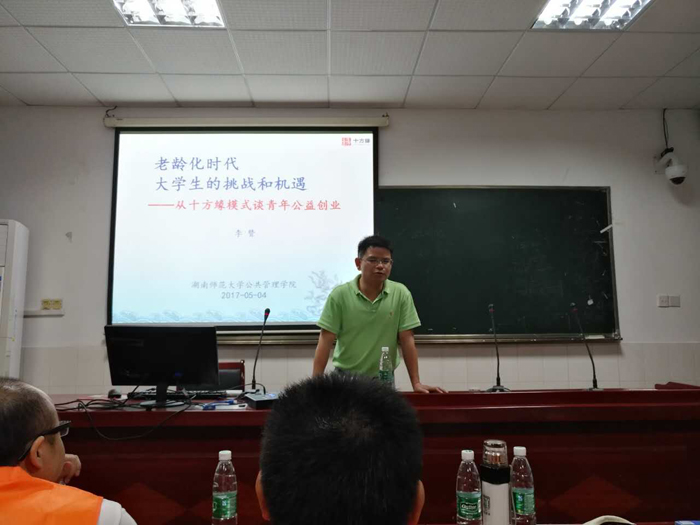 2017年5月4日晚,李赞博士回母校讲学,与公共管理学院师生分享从事青年公益创业的心路历程和切身体会。该讲座的主题为“老龄化时代大学生的挑战与机遇——从十方缘模式谈青年公益创业”。讲座由我院陈彬副教授主持,社会学系系主任胡书芝副教授、赵玉燕副教授、谭卫华博士、长沙“爱与陪伴”老人心灵呵护中心的一些义工与员工以及公管院的本科生与研究生约60余人参加了此次讲座。
