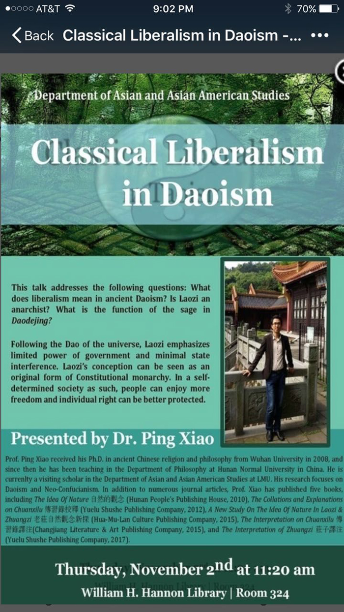 正在美国洛杉矶罗耀拉玛丽蒙特大学哲学系和亚裔与亚裔美国人研究中心(DAAAS)访学的我院哲学系教师萧平,接受该中心王艳杰教授邀请,于美国当地时间11月2日作了题为“道家的古典自由主义”的公开讲座。该讲座介绍了古代道家自由主义的三种类型,即老子的政治自由主义,杨朱的激进自由主义,庄子的精神自由主义,并分别从宇宙论、本体论角度阐述了老子哲学中的“道”以及天道观,分析了“自然”概念的两层内涵“物之自然”(必然)与“人之自然”(自由)及其内在张力,介绍了“无为”作为一种规范原则对于保证人的自由的重要性。老子不是无政府主义者,但他强调最小的政府,最少的干涉,实质上是一种原始形态的虚君自治社会。在这样的社会里,百姓能够享受更多的自由,个人的权利能得到更好的保护。最后萧老师还介绍了老子政治哲学在当代政治实践中的价值。