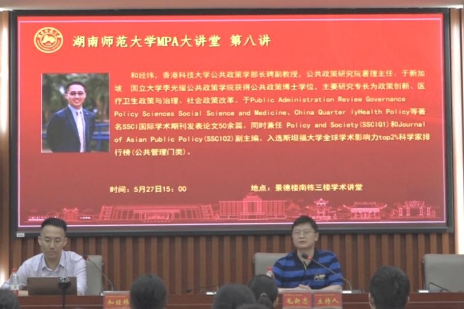 通讯员 房雪婷 方杰)5月27日下午,湖南师范大学MPA大讲堂第八讲在景德楼南栋三楼学术讲堂顺利举行。香港科技大学和经纬长聘副教授应邀开展了题为“从多案例分析到QCA:公共政策场景下的应用与创新”的学术讲座。此次讲座由公共管理学院院长毛新志主持,MPA教育中心执行副主任刘茜以及公管院部分MPA导师、MPA学生、研究生和本科生以线下和线上相结合的方式参与本次讲座。