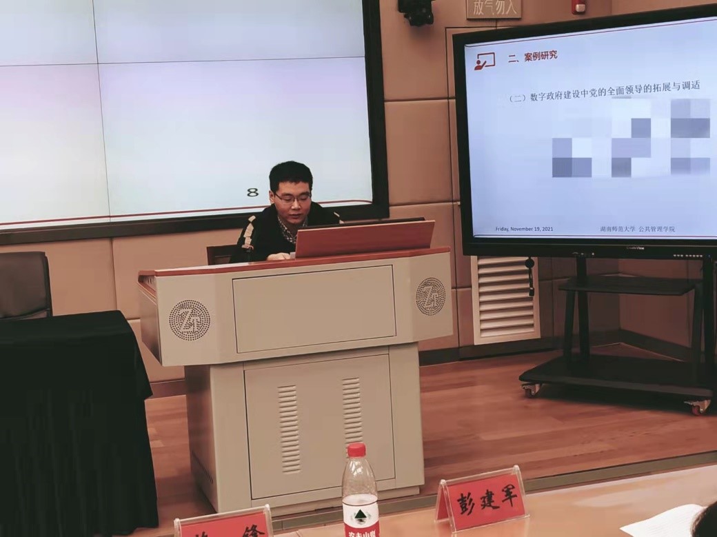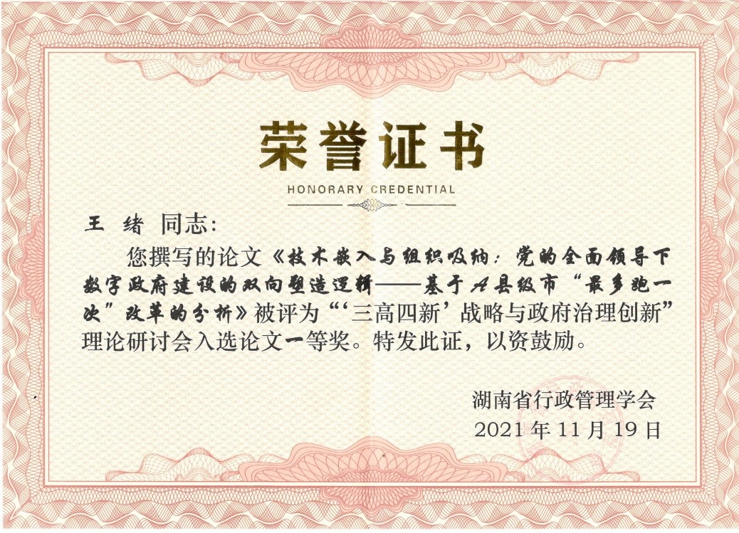 (通讯员 肖佳妮)2021年11月19日上午,湖南省行政管理学会2021年年会暨理论研讨会在中共湖南省委党校(湖南行政学院)召开。公共管理学院政治学理论专业博士研究生王绪的论文《技术嵌入与组织吸纳:党的全面领导下数字政府建设的双向塑造逻辑——基于A县级市“最多跑一次”改革的思考》被评为优秀论文一等奖,并作为五位代表之一进行大会主题发言,获得大会好评。据悉,这是本次会议大会发言的唯一研究生代表。