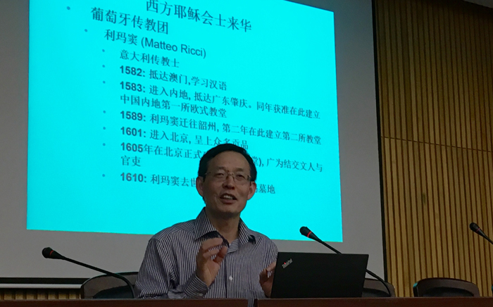 李晟文教授以丰富的史料、生动的图片、诙谐的语言,向百余师生展开了一幅幅中西文化交流的历史画卷,客观地评述了在中国闭关锁国的时代,从利玛窦、汤若望、南怀仁到张诚、白晋、郎世宁等为代表的传教士在中西文化交流中的作用与影响。提问环节中,现场气氛热烈,师生踊跃发问,李晟文教授对问题一一进行了耐心解答,就相关的问题进行了探讨。