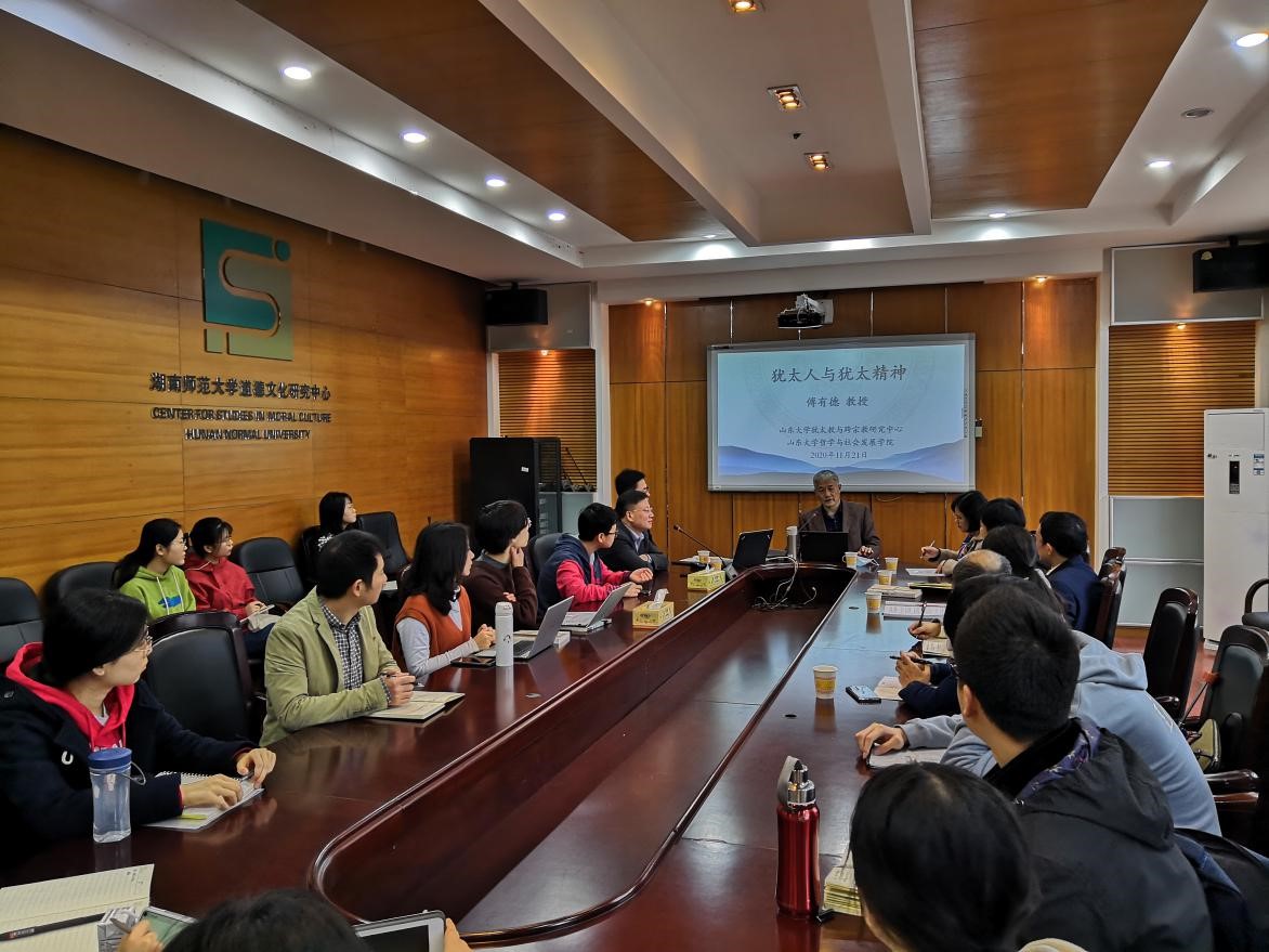 11月21日上午,教育部人文社会科学重点研究基地山东大学犹太教与跨宗教研究中心主任、哲学与社会发展学院宗教学系主任傅有德教授应邀莅临我院讲学,在公共管理学院415会议室为我院师生作题为“犹太人与犹太精神”的学术讲座。该讲座由道德文化研究院常务副院长、哲学系主任向玉乔教授主持,我院哲学系师生约40人参加了本次讲座。