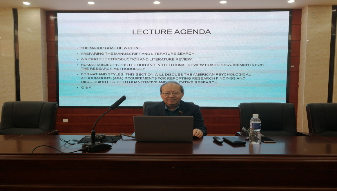Serge Lee教授从美式论文写作中如何准备手稿和文献检索、如何撰写引言和文献综述、人的保护与制度审查委员会对研究方法的要求、美国心理学会对报告研究结果的格式和风格的要求、定性和定量研究论文写作异同五个方面进行了精彩讲授。Serge Lee教授幽默风趣的语言风格和科学严谨的学术情怀赢得现场听众的阵阵掌声。