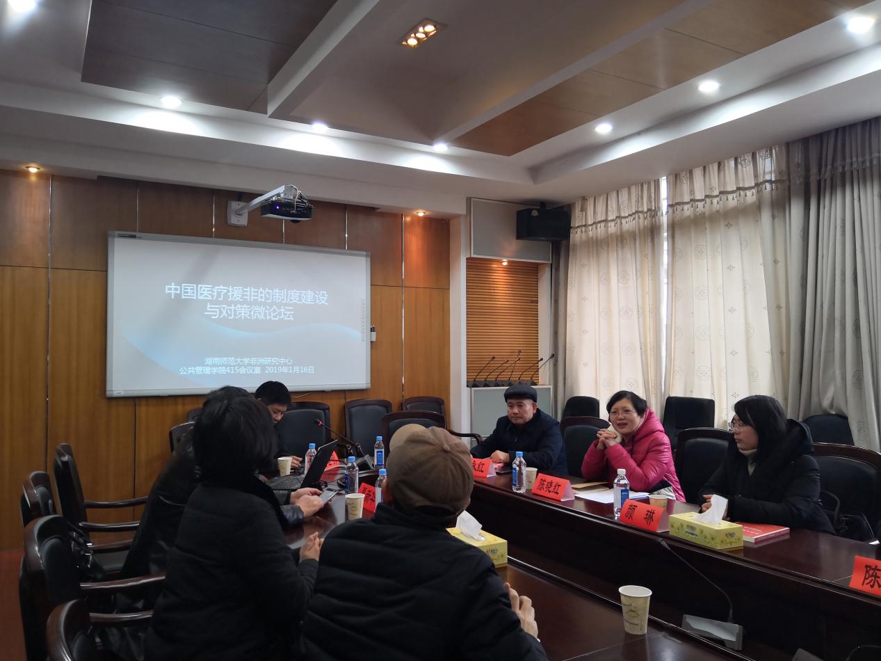 (通讯员廖云)1月16日下午,我校非洲研究中心在公共管理学院415会议室举行了主题为“中国医疗援非的制度建设与对策”的论坛,来自中国社会科学院西亚非洲研究所、湘潭大学法律与社会文化研究中心、中国驻乌干达孔子学院、中南林业科技大学、本校法学院、公管院专家学者及硕、博学生10余人参加了会议。与会来宾围绕“医疗援非如何与一带一路的倡议对接”、“湖南在塞拉利昂医疗援非的基本情况”、“湖南医疗援非如何与湖南与非洲的经贸合作对接”等议题展开了深入的探讨。