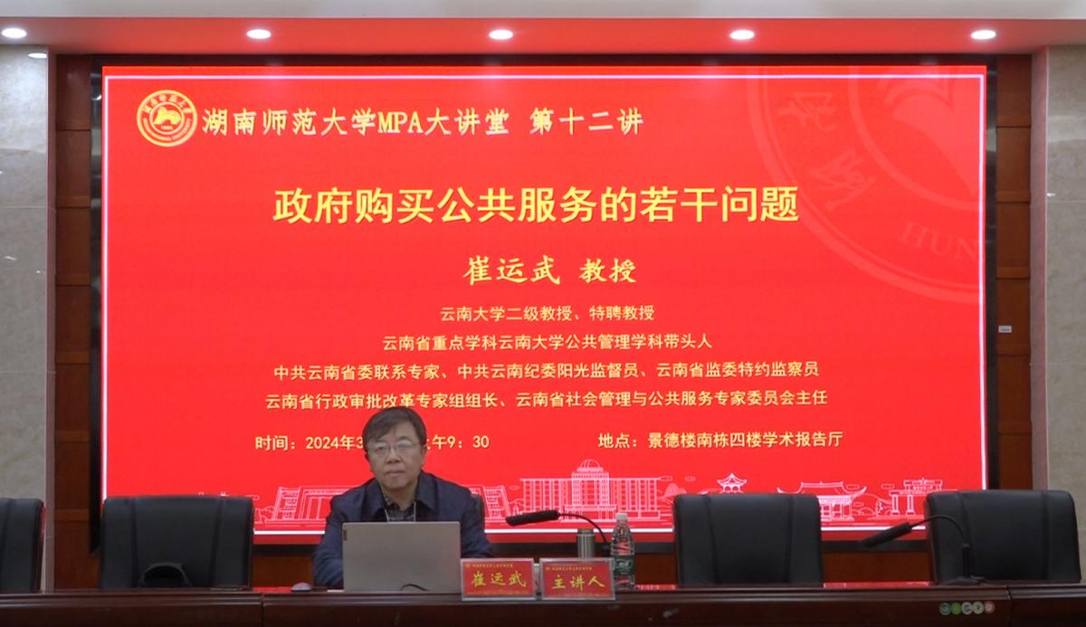 (通讯员 陈璇)3月23日上午,湖南师范大学MPA大讲堂第十二讲在景德楼南栋四楼学术报告厅成功举行。云南大学崔运武教授应邀为我院师生作题为“政府购买公共服务的若干问题”的学术讲座。本次讲座由我校MPA教育中心执行主任刘茜副教授主持,我院肖建华教授、蘧垣志老师及部分MPA学生、相关专业的研究生和本科生到现场参与本次讲座。