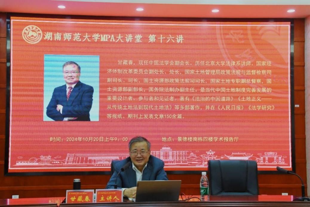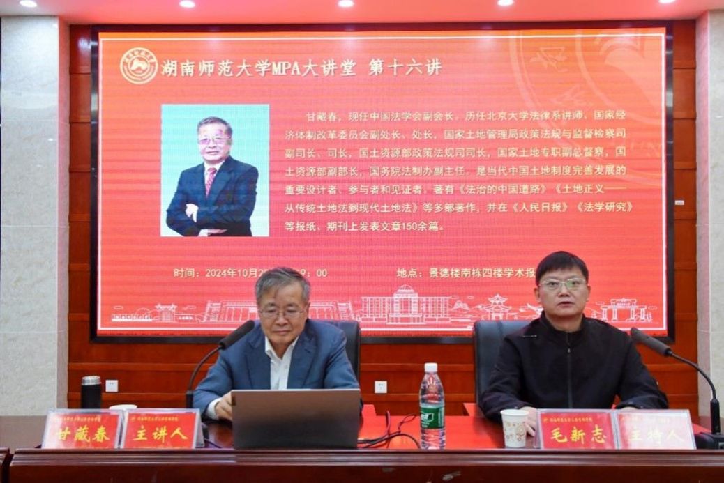 (通讯员:黄雁冰)10月20日上午,湖南师范大学MPA大讲堂第十六讲在景德楼南栋四楼学术报告厅成功举办。中国法学会甘藏春副会长应邀为我院师生作题为“当代中国土地制度的理论逻辑与实践逻辑”的学术讲座。讲座由公共管理学院院长毛新志教授主持,周小毛教授、胡守勇教授、MPA教育中心执行主任刘茜副教授、政治学与行政管理系主任付振奇副教授、瞿理铜副教授、地理科学学院胡贤辉副教授、文高辉副教授及MPA学生、相关专业的研究生和本科生到现场参与本次讲座。