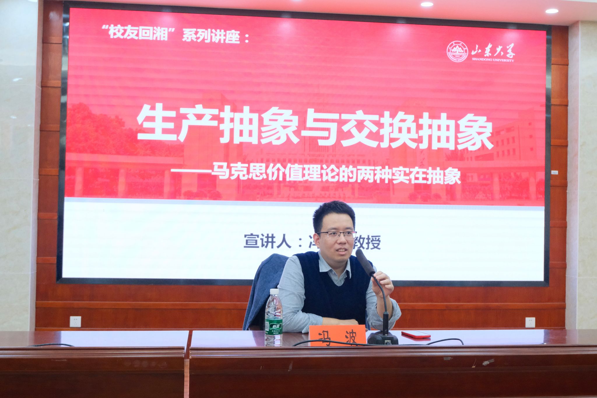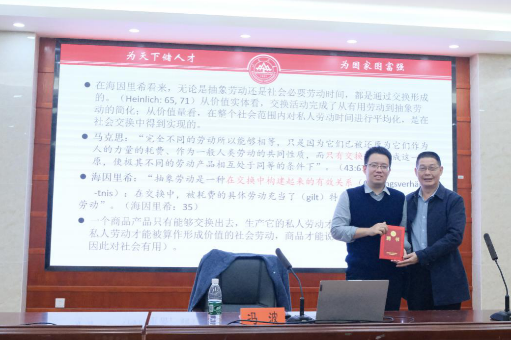 此次讲座共有三个环节。一是校友讲座。在讲座中,冯波教授首先回忆自己的本科校园生活,拉近与同学们的距离。他结合日常生活,举出相关事例,引入“生产抽象”和“交换抽象”两个概念,并明确了它们的定义。冯教授对生产抽象的社会性质进行了详细的解释和说明,他提出大众常见的误解,并基于马克思哲学的观点,运用反证法说明生产抽象是一种实际抽象,而不是思维抽象。他还阐述交换抽象的循环论证问题,提出论点抽象劳动是交换劳动的结果,一步步推理论证,解决价值与交换的循环论证问题,澄清生产抽象与交换抽象之间的关系。二是答疑互动。冯波教授回答了同学们有关讲座内容的疑惑,并在专业学习上提出方法和建议。他鼓励同学们多阅读经典著作,学会跨专业、跨视域理解同一个观点,以便有新的收获。三是颁发聘书。余望成书记为冯教授颁发“校外成长导师”的聘书,并合影留念。