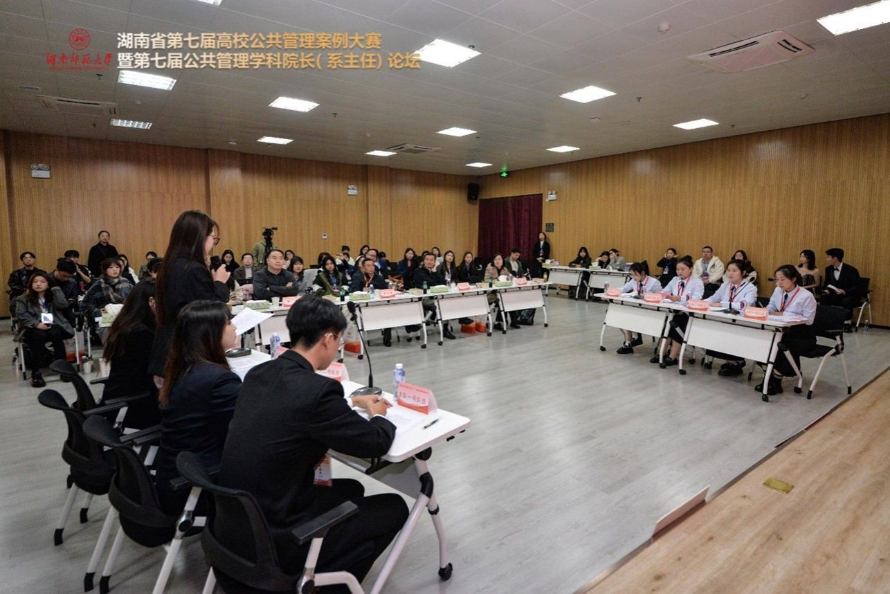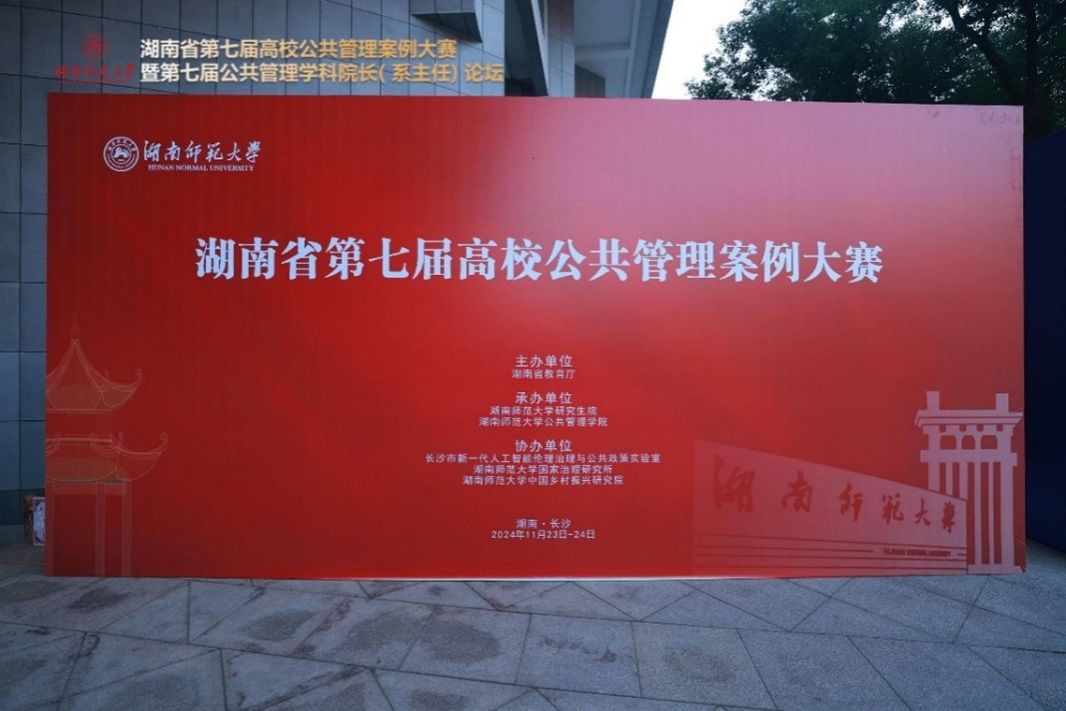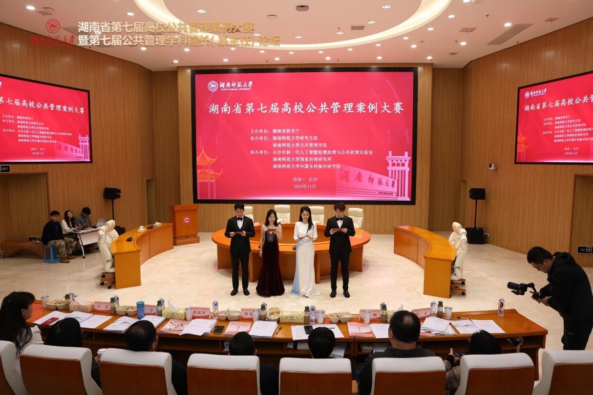 (通讯员:程中培 覃健 朱孝源)2024年11月23日-24日,湖南省第七届高校公共管理案例大赛暨第七届公共管理学科院长(系主任)论坛在湖南师范大学圆满举行。此次大赛由湖南省教育厅主办,湖南师范大学研究生院和湖南师范大学公共管理学院承办,长沙新一代人工智能伦理治理与公共政策实验室、湖南师范大学国家治理研究所、湖南师范大学中国乡村振兴研究院协办。