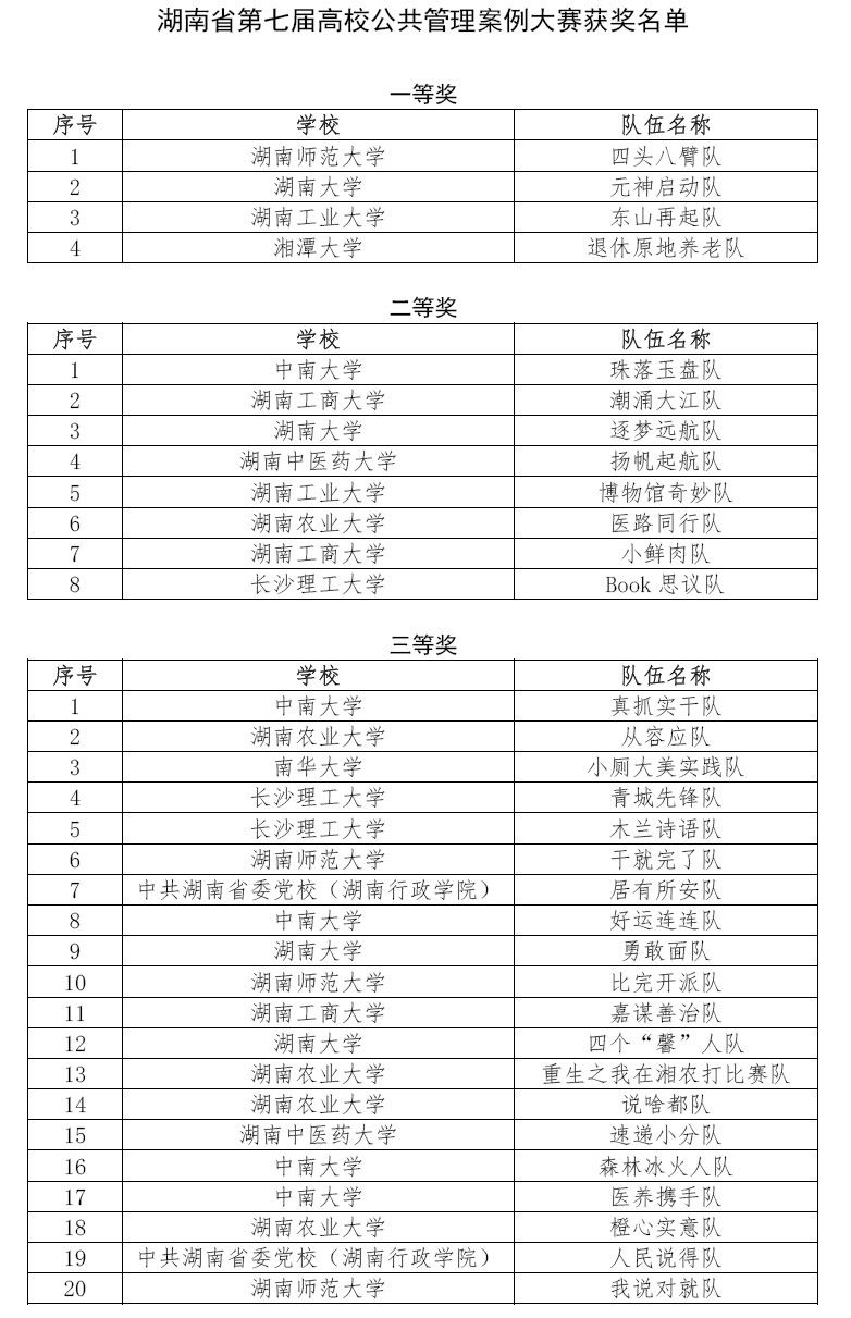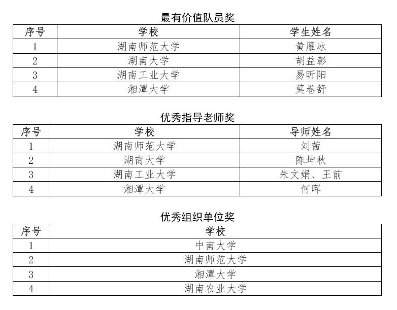 湖南师范大学“四头八臂队”、湖南大学“元神启动队”、湖南工业大学“东山再起队”、湘潭大学“退休原地养老队”四支参赛队伍荣获本届大赛一等奖,中南大学“珠落玉盘队”、湖南工商大学“潮涌大江队”、湖南大学“逐梦远航队”等八支参赛队获得大赛二等奖,中南大学“真抓实干队”、湖南农业大学“从容应队”、南华大学“小厕大美实践队”等二十支参赛队伍获得大赛三等奖,湖南师范大学黄雁冰、湖南大学胡益彰等四位同学获得最有价值队员奖,湖南师范大学刘茜、湖南大学陈坤秋等教师获得优秀指导老师奖,中南大学、湖南师范大学等高校获得优秀组织单位奖。