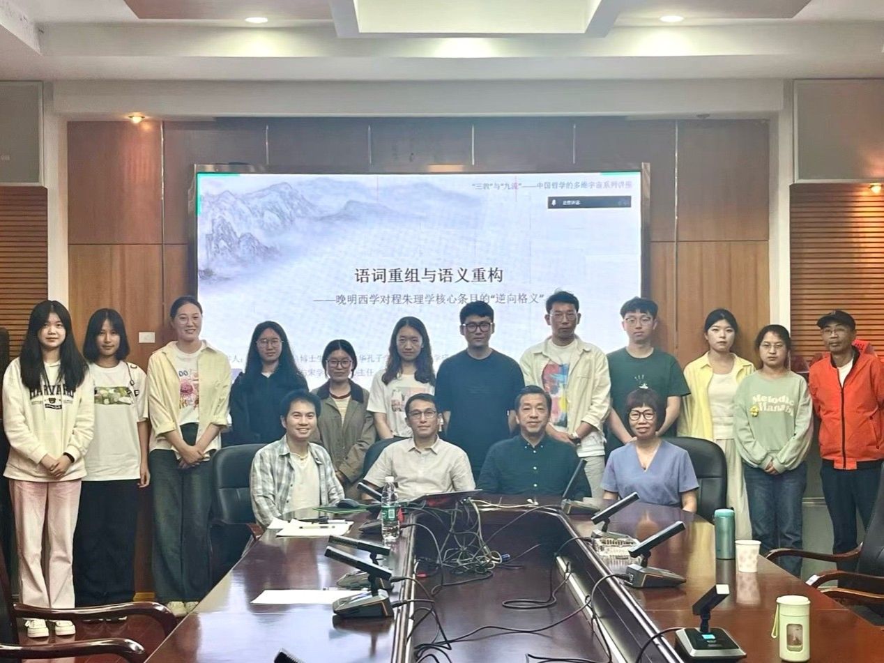 2025年5月15日晚,中华孔子学会二程与洛学研究委员会副会长、河南大学洛学与宋学研究中心主任叶平教授莅临我系讲学,于景德楼415会议室做了题为“词语重组与语义重构——晚明西学对程朱理学核心条目的‘逆向格义’”的精彩报告。本次讲座是哲学系中国哲学教研室策划的“三教”与“九流”——中国哲学的多维宇宙系列讲座之一,由湖南师范大学公共管理学院哲学系、湖南师范大学中华伦理文明研究中心主办。讲座由萧平副教授主持,参与者有郭园兰教授、邹啸宇副教授以及哲学系研究生、本科生。
