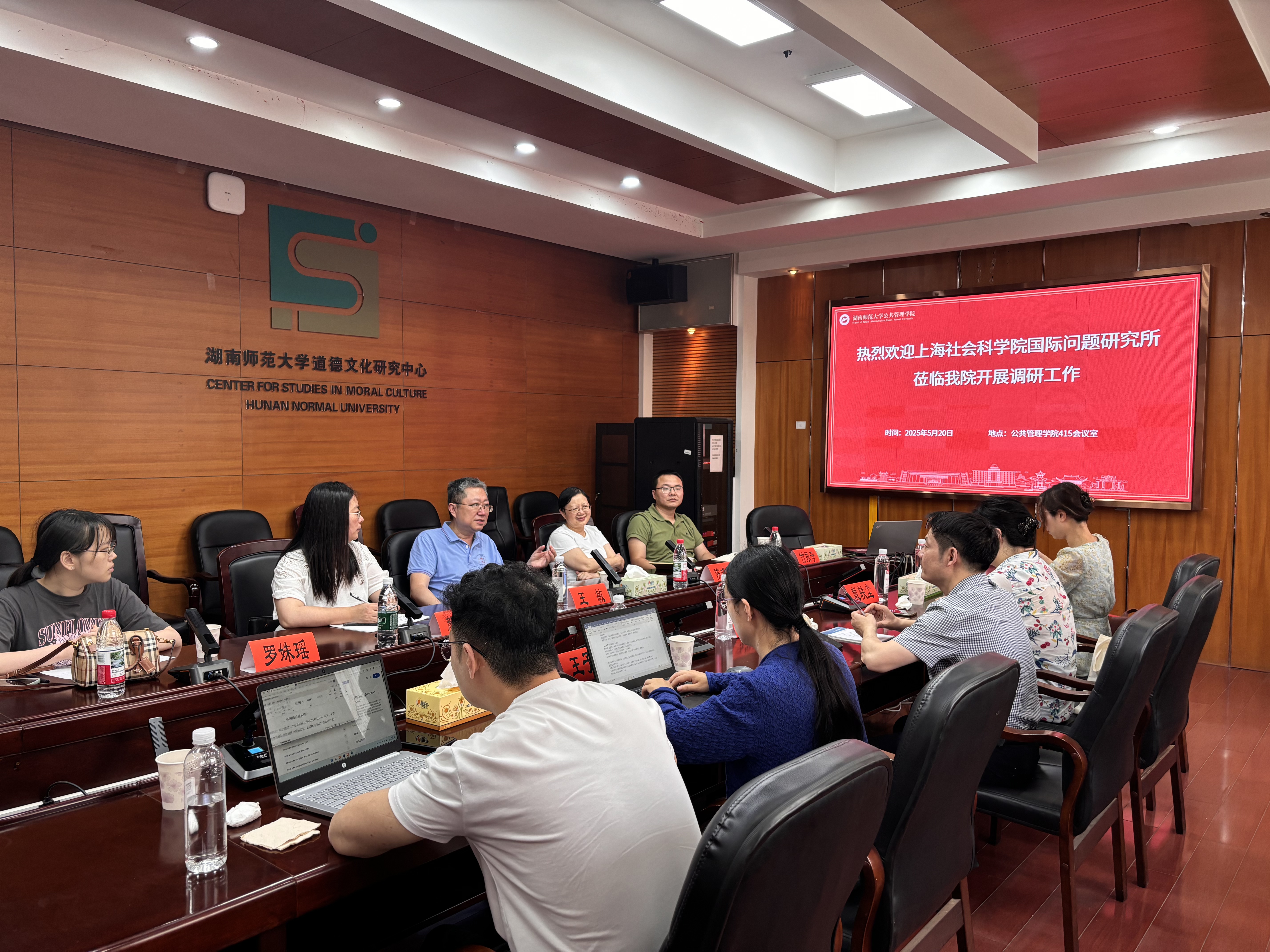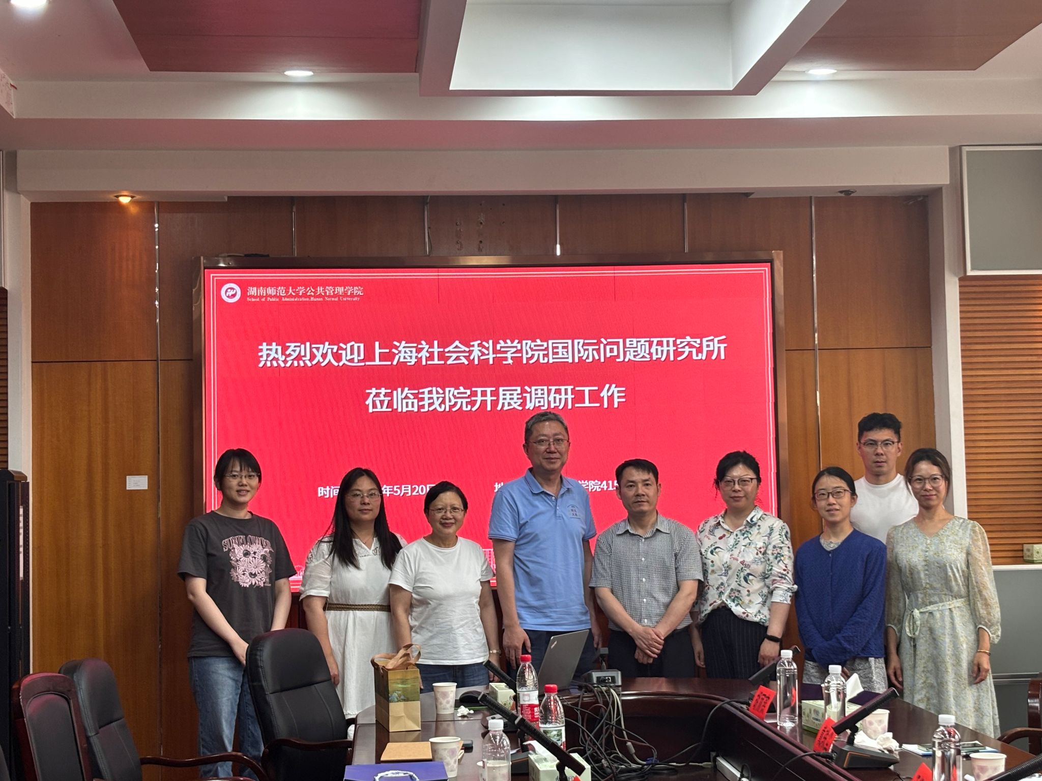 (通讯员 余怡)2025年5月20日上午,上海社会科学院国际问题研究所战略与中国外交研究室副主任汪舒明、欧洲研究室执行副主任戴轶尘,以及王子夔、胡丽燕、严骁骁等青年科研骨干莅临我校,就“大国竞争背景下中国式现代化与新发展格局”主题开展专题调研。湖南师范大学公共管理学院副院长王敏教授、非洲研究中心主任陈晓红教授、政治学与行政管理系主任付振奇副教授、颜琳副教授、罗姝瑶博士等参加座谈交流会。