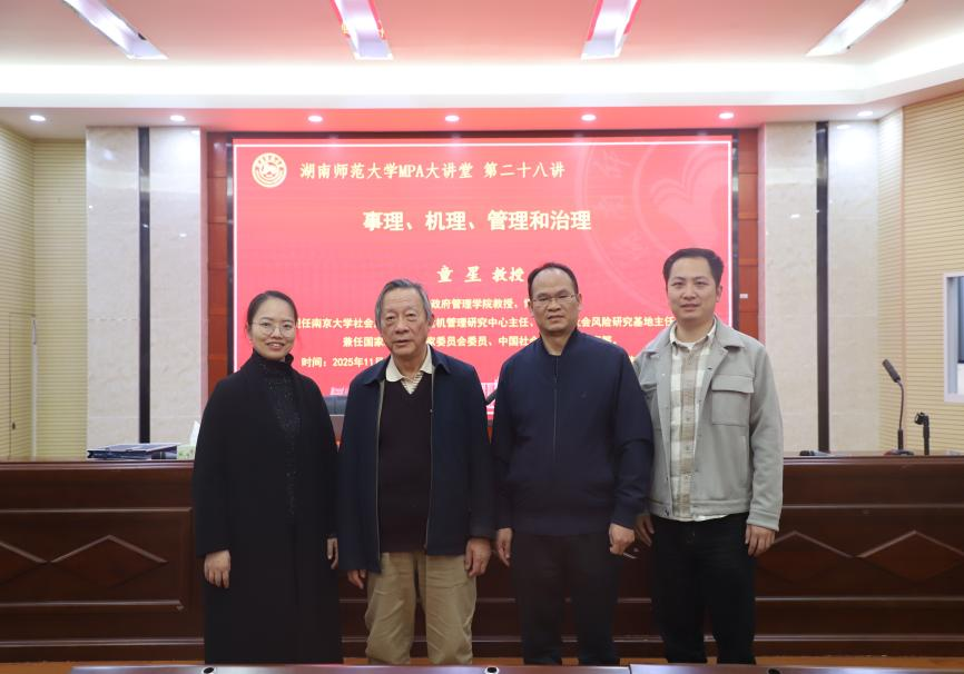 (通讯员:何成欢)11月23日下午,湖南师范大学MPA大讲堂第二十八讲在景德楼南栋4楼报告厅成功举办。南京大学政府管理学院童星教授为我校师生作“事理、机理、管理和治理”为主题的学术演讲。本次讲座由公共管理学院政治学与行政管理系胡扬名教授主持,刘茜副教授、彭小玲老师、程中培老师、我院MPA研究生和本科生参加此次讲座。