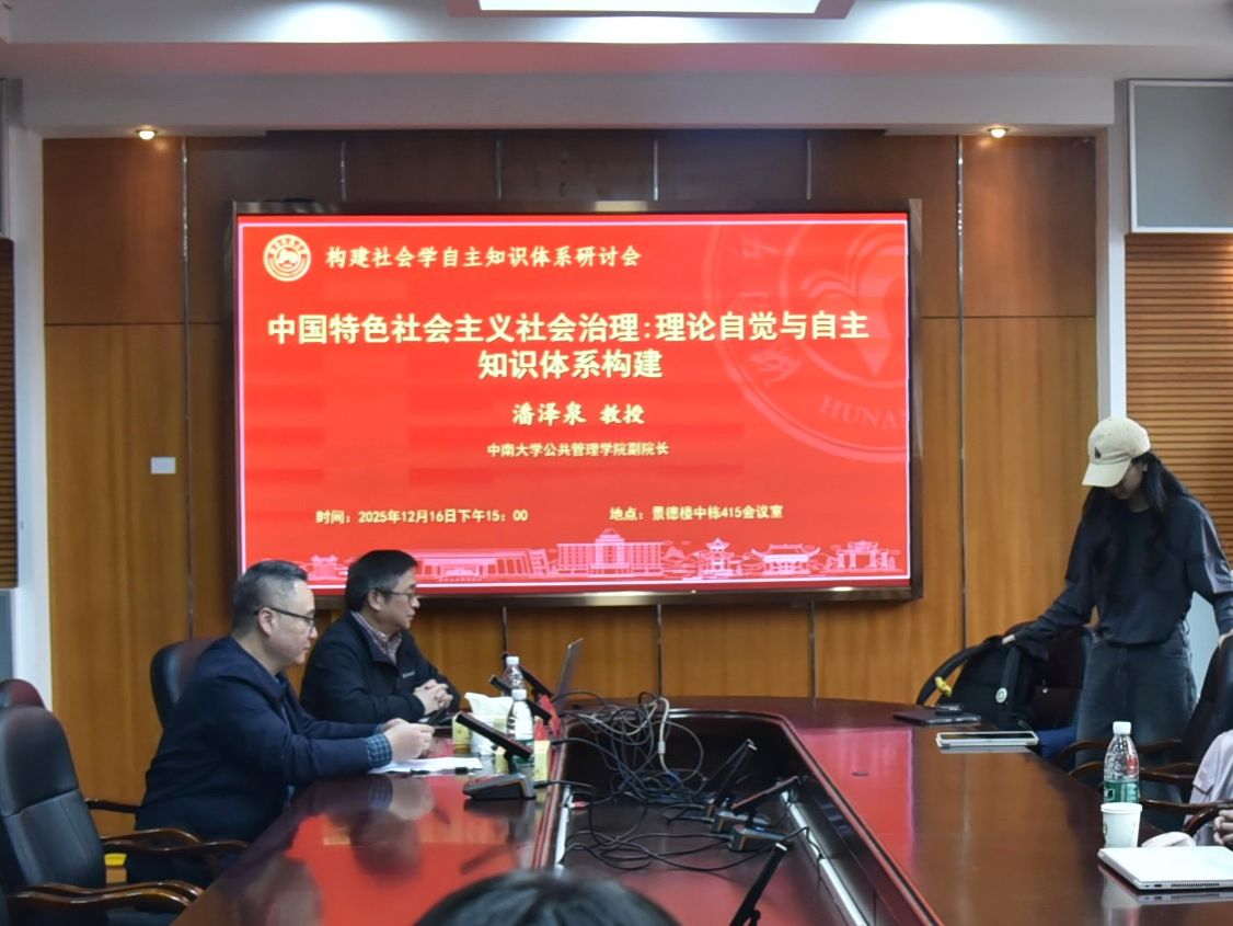 (通讯员 汤思瑶 汪越)2025年12月16日下午15:00,由湖南师范大学政治与公共管理学院主办的“构建政治学、社会学、公共管理学自主知识体系研究”专题研讨会在景德楼中栋415会议室隆重举行。中南大学公共管理学院副院长、博士生导师潘泽泉教授受邀以“中国特色社会主义社会治理:理论自觉与自主知识体系构建”为题作了一场兼具理论深度与实践价值的学术报告,湖南师范大学相关院系师生参与本次研讨。