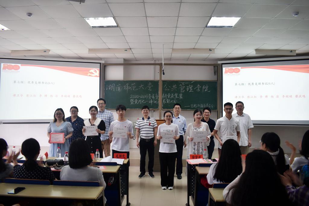 大会在《国际歌》中拉开帷幕,公共管理学院院长毛新志介绍了发展新党员情况并宣读党内评优表彰决定。全体新党员进行入党宣誓,老党员重温入党誓词,砥砺初心使命。学院党委委员和嘉宾老师为先进基层党支部、优秀党日活动、优秀共产党员、优秀党务工作者、优秀支部书记、优秀入党积极分子培养联系人、党员示范寝室、湖湘红色故事微宣讲等获奖集体和个人颁发了荣誉证书。