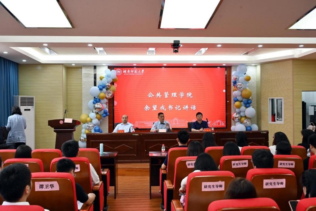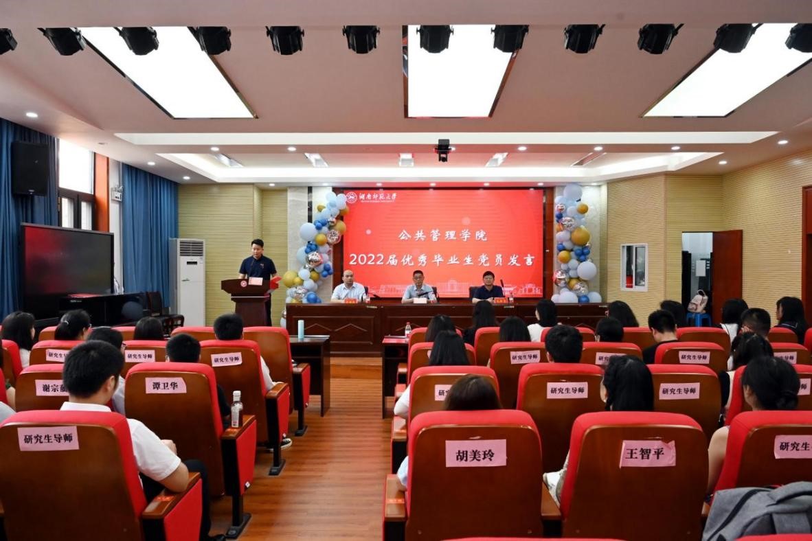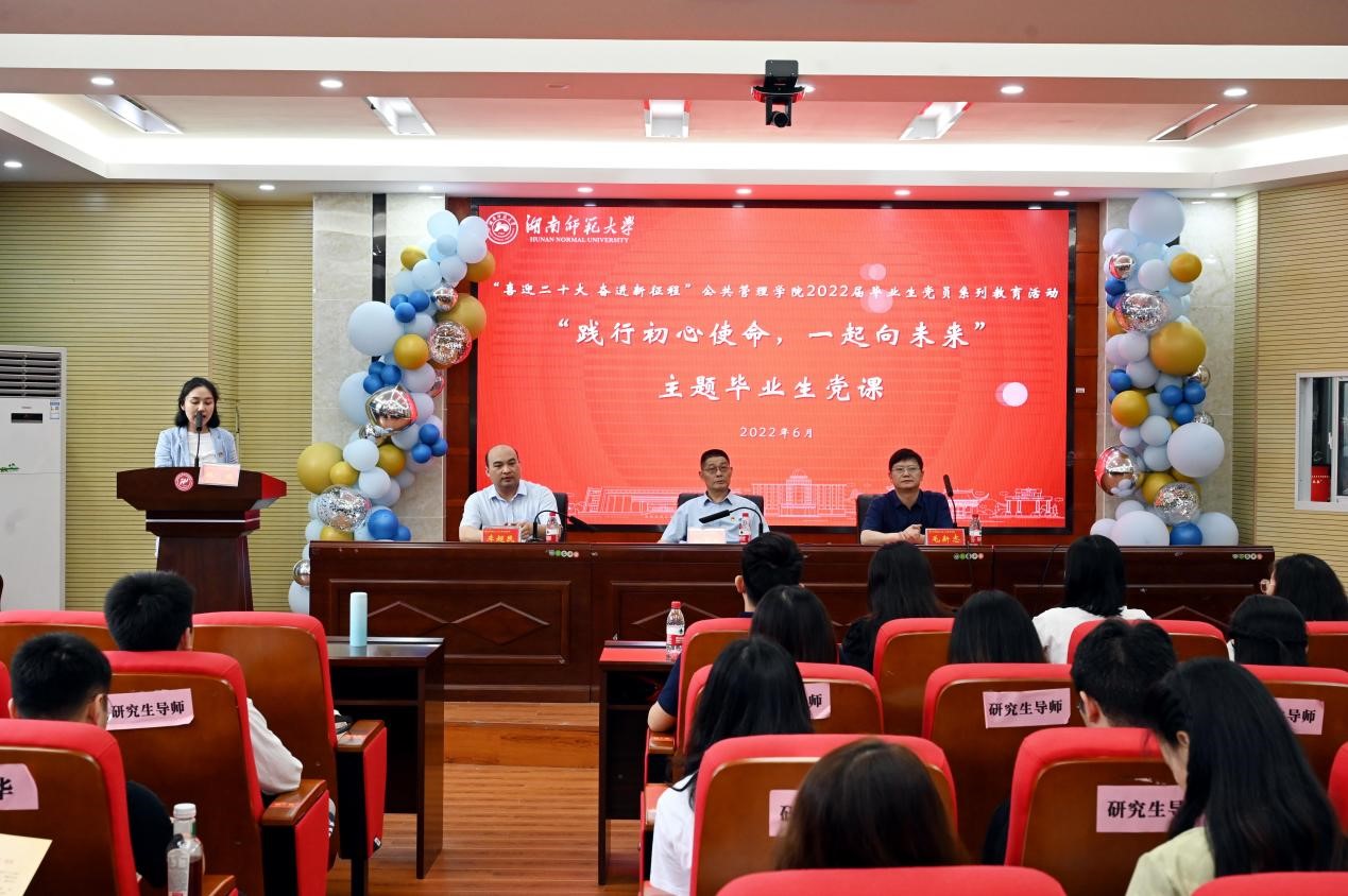 6月15日下午,公共管理学院“践行初心使命,一起向未来”2022届毕业生党员主题党课在博后楼四楼报告厅隆重举行。学院党委书记余望成、院长毛新志、副院长李超民以及党办和研办相关教师出席。活动由专职组织员林峻主持。
