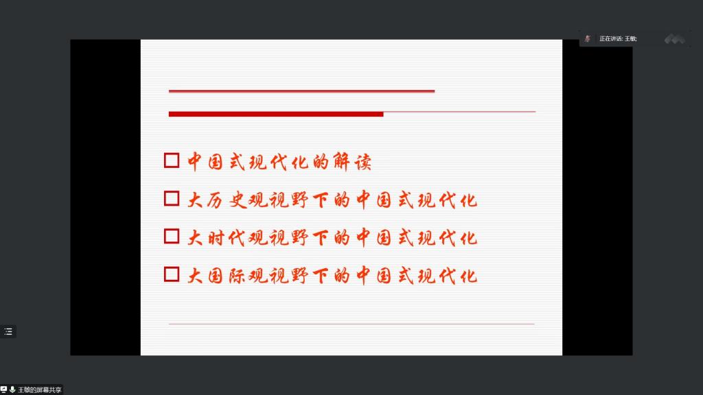 李中仁做总结发言。他表示,王敏教授的报告兼具理论高度和现实指导意义,既揭示了中国式现代化的深刻内涵和特征,又阐明了中国式现代化对于实现第二个百年奋斗目标、全面推进中华民族伟大复兴的重大意义,为本支部全体党员深入理解与贯彻落实二十大精神提供了很好的启示和帮助。