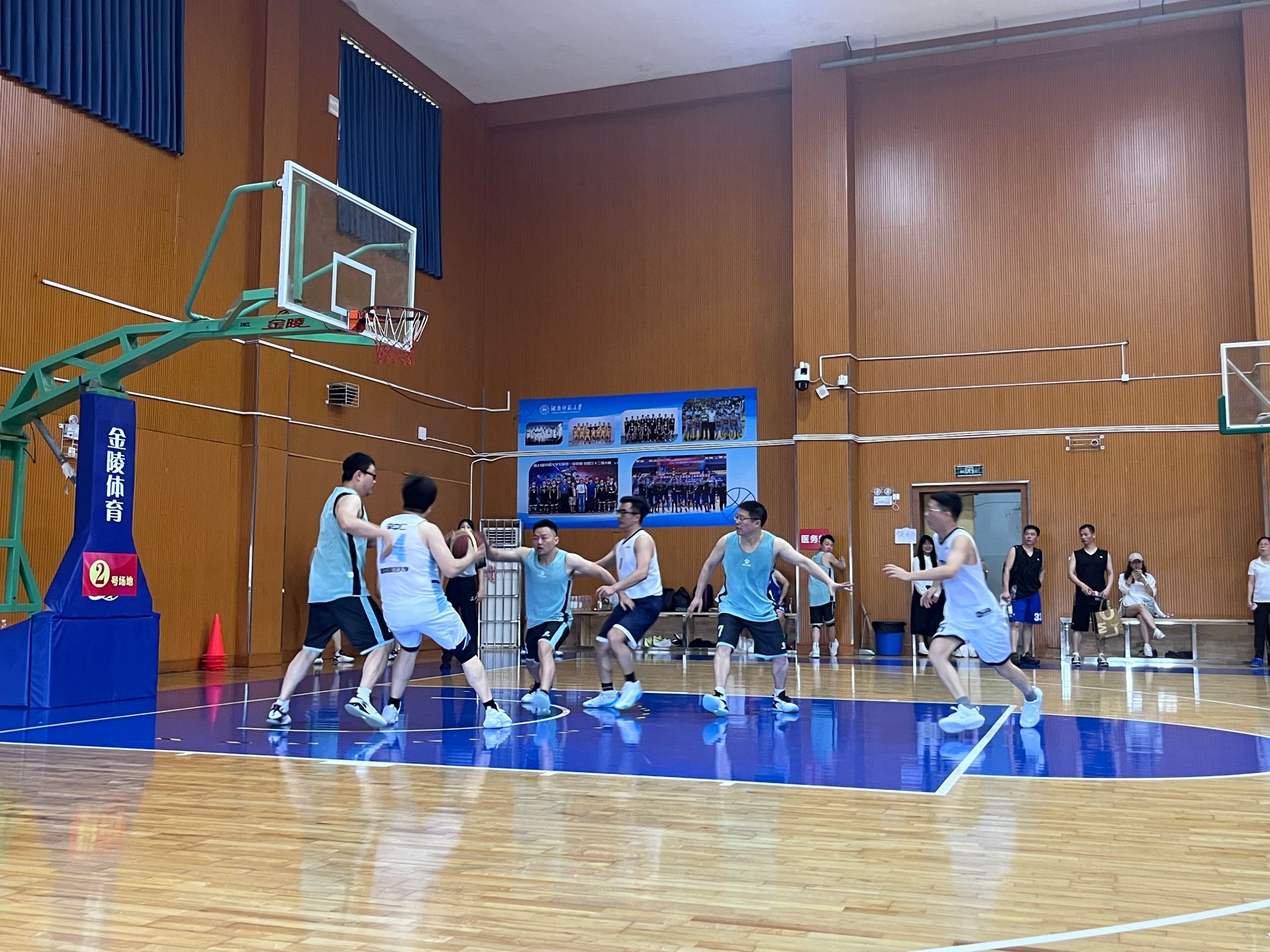 5月18日上午,首场比赛中,我院教职工篮球队以31:12的比分战胜旅游学院篮球队,取得开门红。下午,我院教职工篮球队继续保持强劲势头,以14:6的比分战胜机关一篮球队。